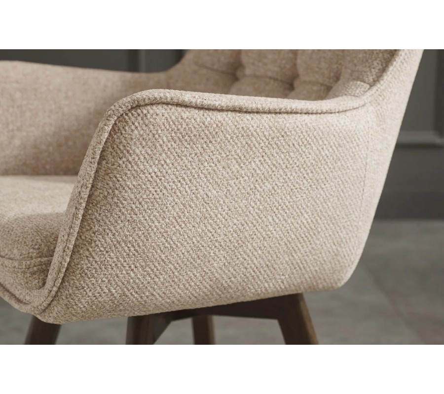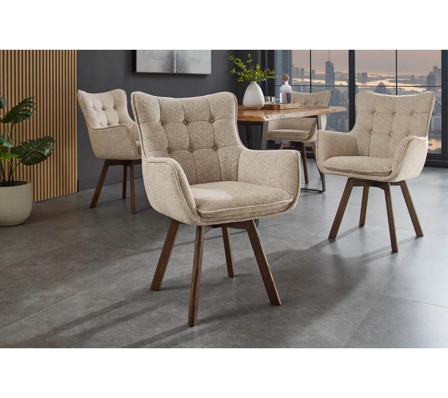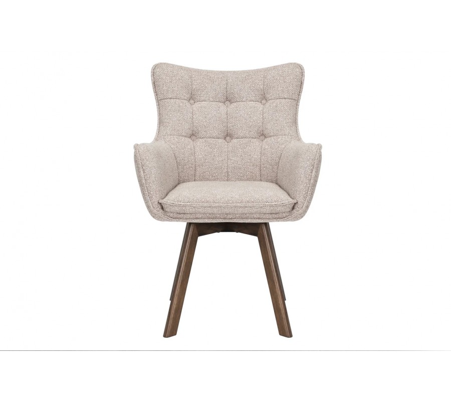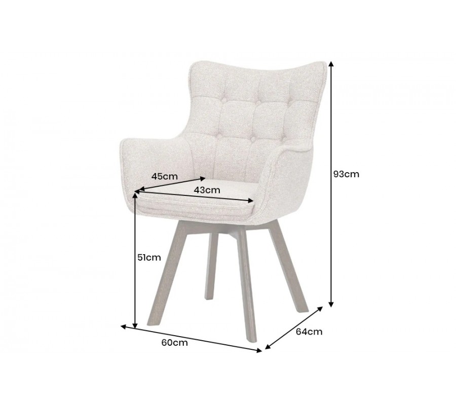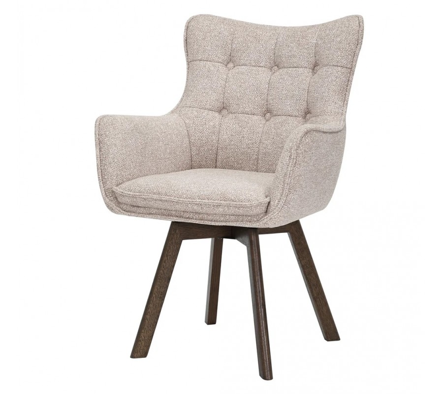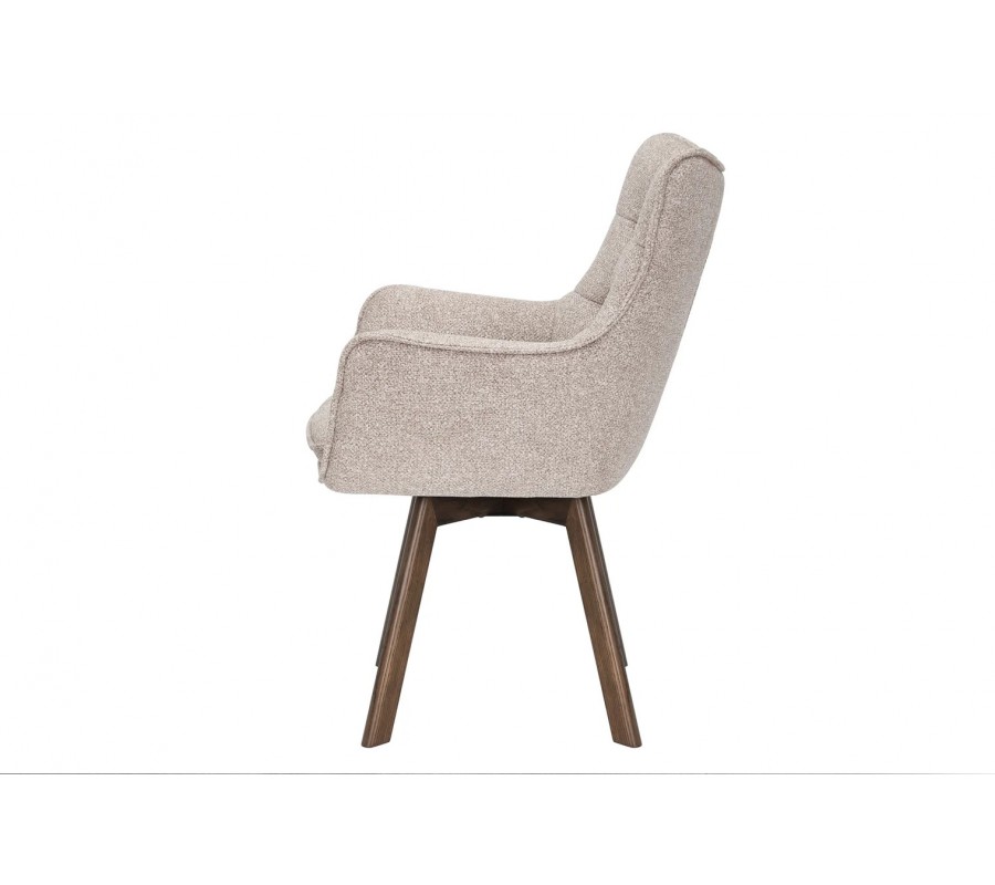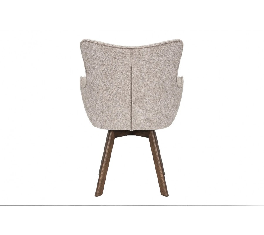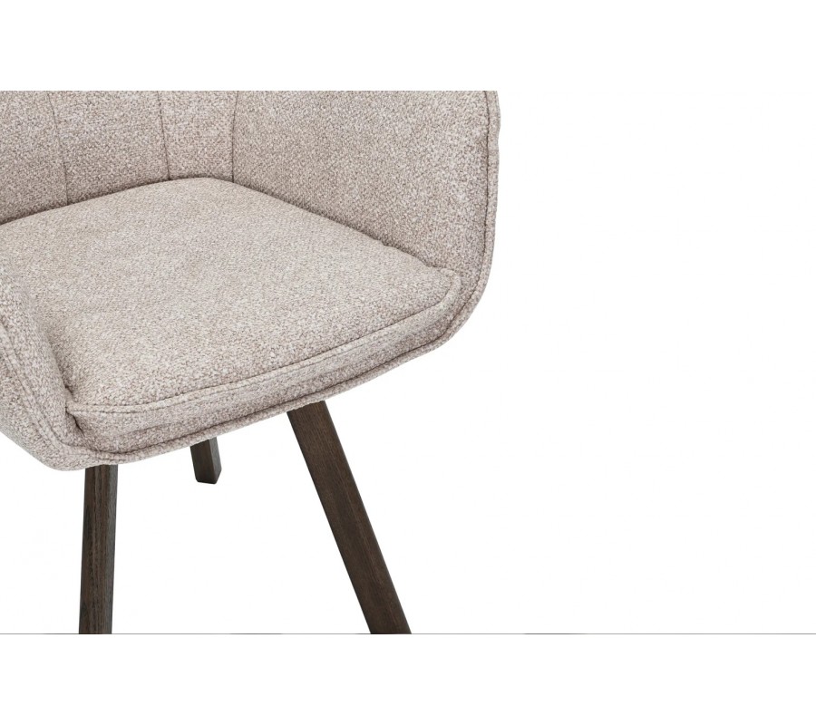 Podstavu tvoria štyri hranaté nožičky z masívneho dubového dreva v tmavohnedom odtieni. Drevo so svojou prirodzenou kresbou pôsobí robustne a zároveň elegantne. V konštrukcii nad nožičkami je umiestnený otočný mechanizmus, ktorý umožňuje plynulú 360 stupňovú rotáciu, čo zvyšuje praktickosť kresla pri každodennom používaní.