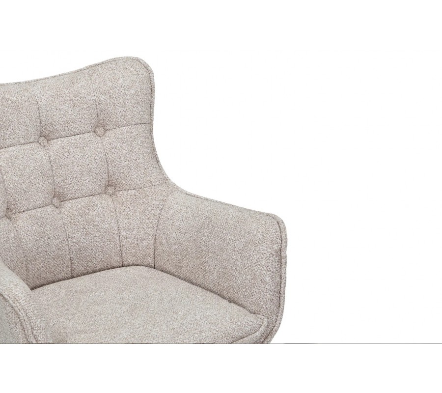 Chrbtová opierka je mierne rozšírená a doplnená o tradičné gombíkové čalúnenie, čo jej dodáva nadčasový vzhľad. Opierky na ruky sú navrhnuté tak, aby prirodzene nadväzovali na celkový tvar kresla, takže pôsobí jednoliato a ergonomicky.