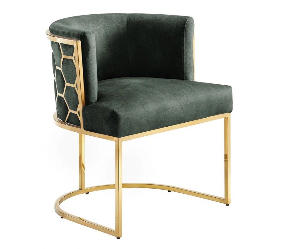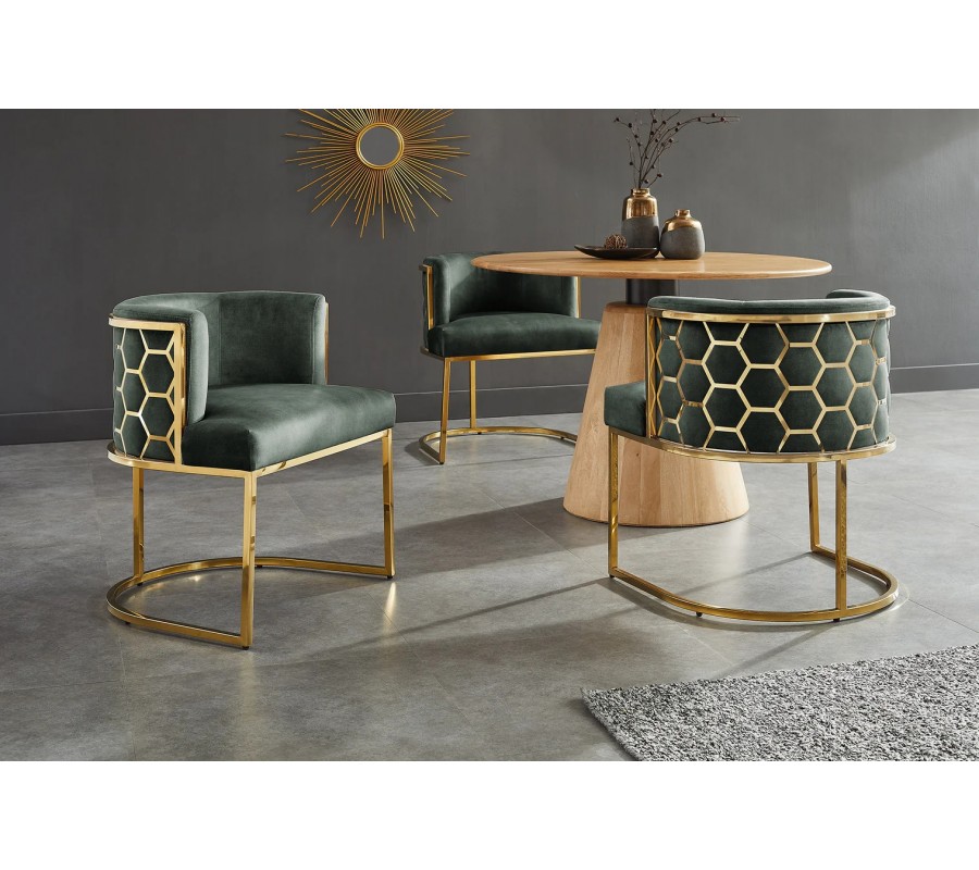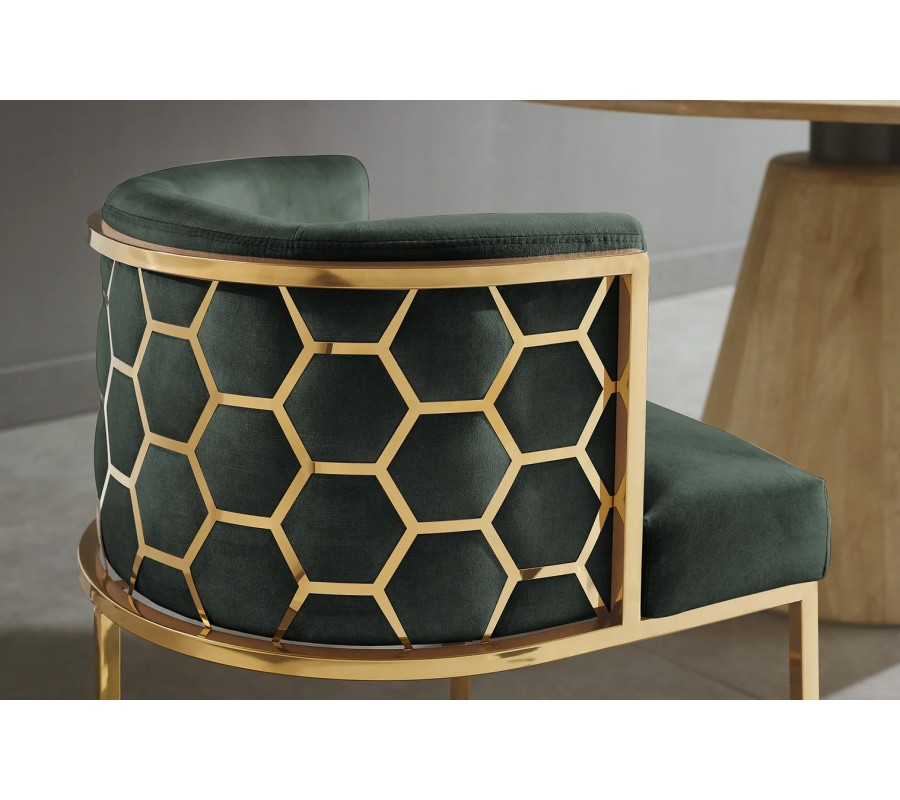Art deco jedálenská stolička Leara so zeleným zamatovým poťahom a zlatou konštrukciou s dizajnom šesťuholníkov 64 cm
