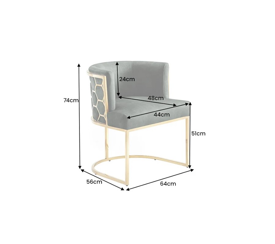 Konštrukcia je vyrobená z nehrdzavejúcej ocele v lesklom zlatom prevedení, ktoré prináša do dizajnu nádych glamour štýlu. V spodnej časti sa nachádza podstava v tvare U, ktorú s rámom pod sedadlom prepájajú tri štíhle nožičky - dve na predných rohoch a jedna v strede zadného oblúku. Čalúnenie prekrýva na zadnej strane dizajnová opierka s geometrickým vzorom šesťuholníkov, pripomínajúcim medové plásty.
