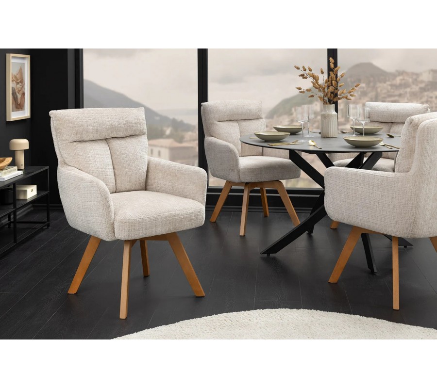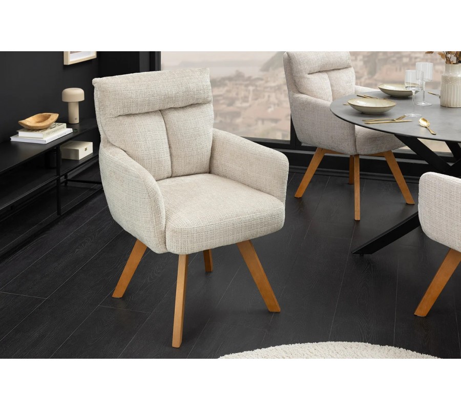 Dizajnová škandinávska otočná jedálenská stolička Dover s béžovým ženilkovým poťahom a hnedými drevenými nohami 61 cm