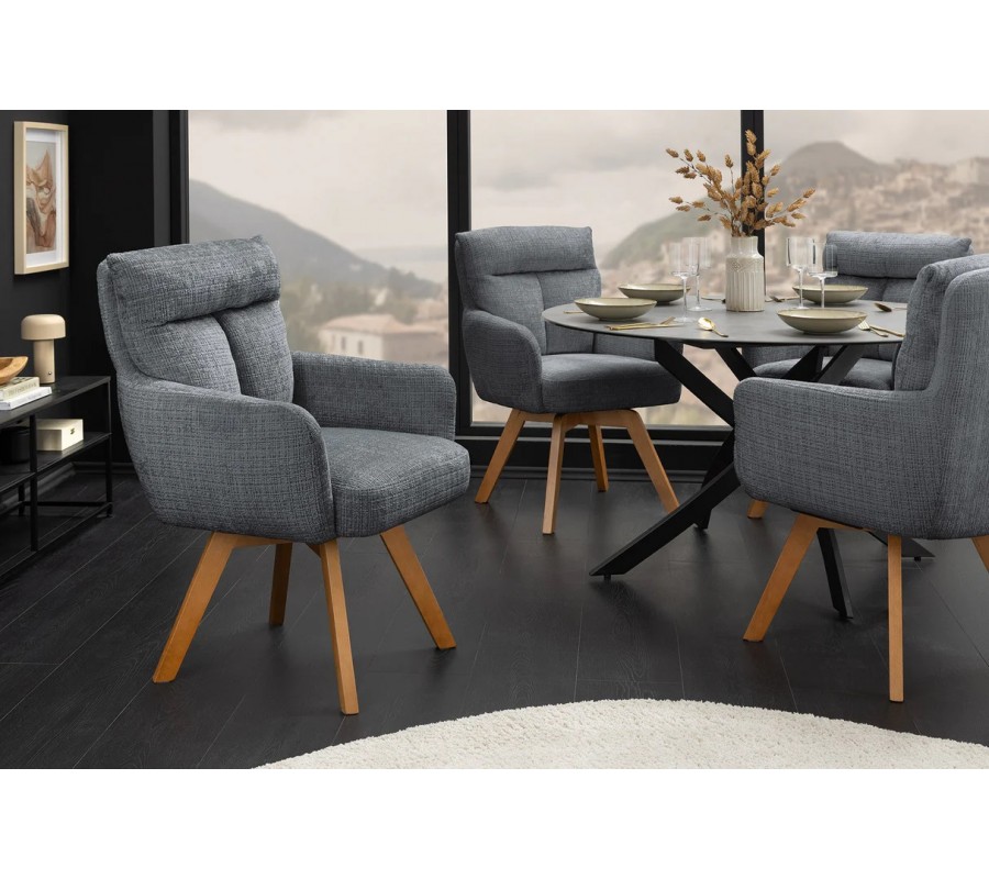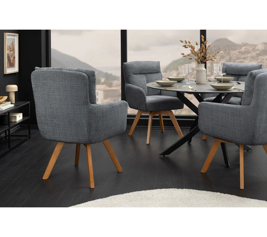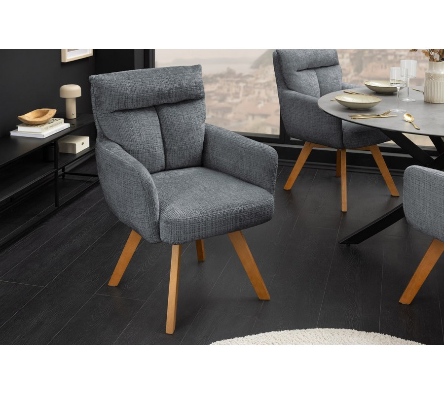 Moderná dizajnová sivá jedálenská stolička Dover s otočným sedadlom s opierkami a ženilkovým poťahom s hnedými nohami 61 cm