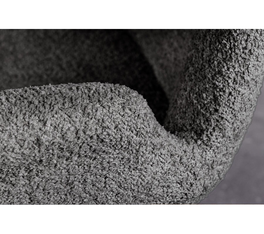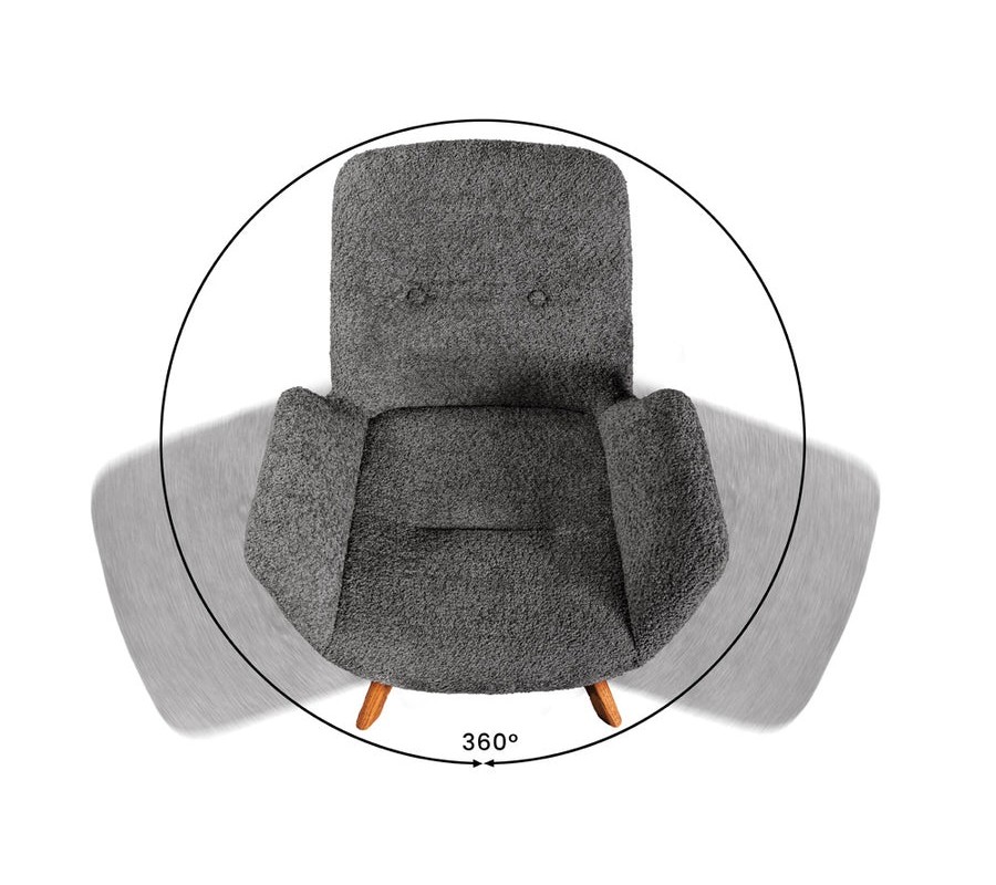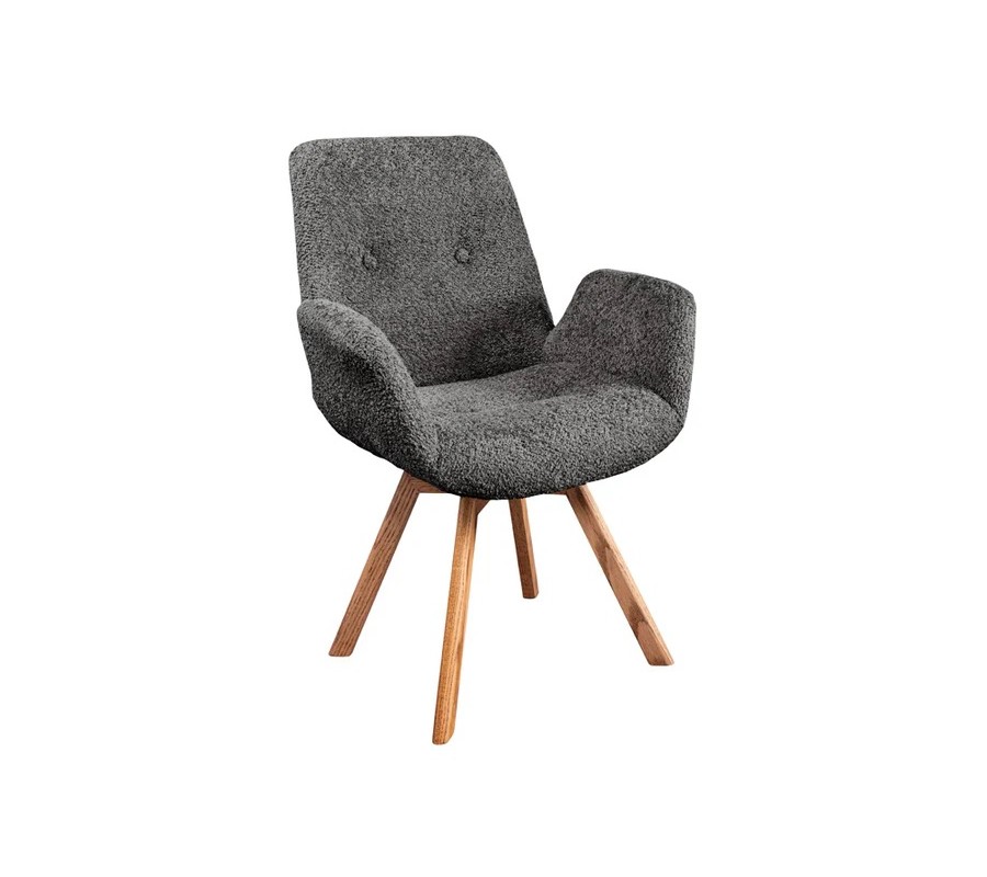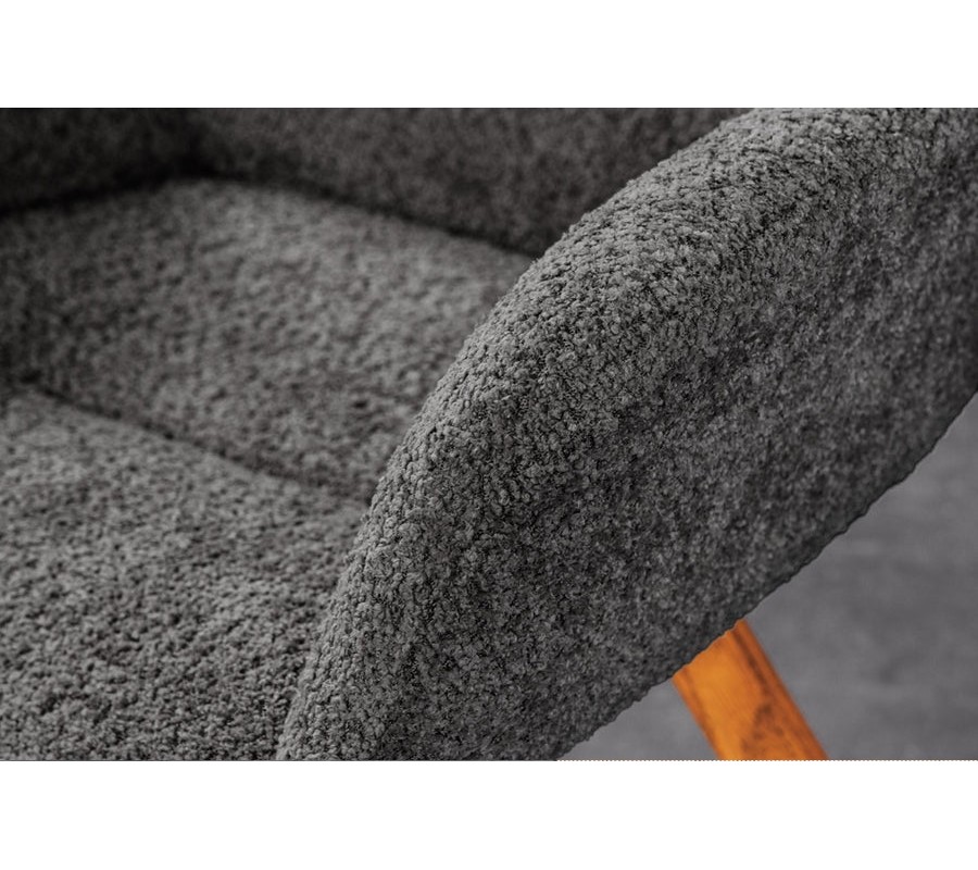Sedaciu časť dopĺňa mäkké čalúnenie a buklé poťah s bohatým nadýchaným vizuálom v tmavej sivej farbe. Stoličke dodávajú elegantnú zaoblenú siluetu. Sedadlo má obdĺžnikový tvar so zakrivenou spodnou časťou, ktorá plynule prechádza do nízkych bočných opierok na ruky. Ich tvar sa smerom hore mierne zužuje a obdĺžniková chrbtová opierka je v zošikmenej línii napojená len na sedadlo, čo dizajn vizuálne odľahčuje. Jedna prešívaná línia na sedadle a dva okrúhle gombíky na chrbtovej opierke tvoria minimalistické zdobenie.