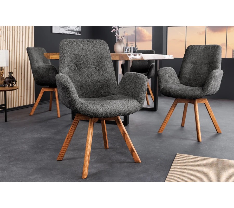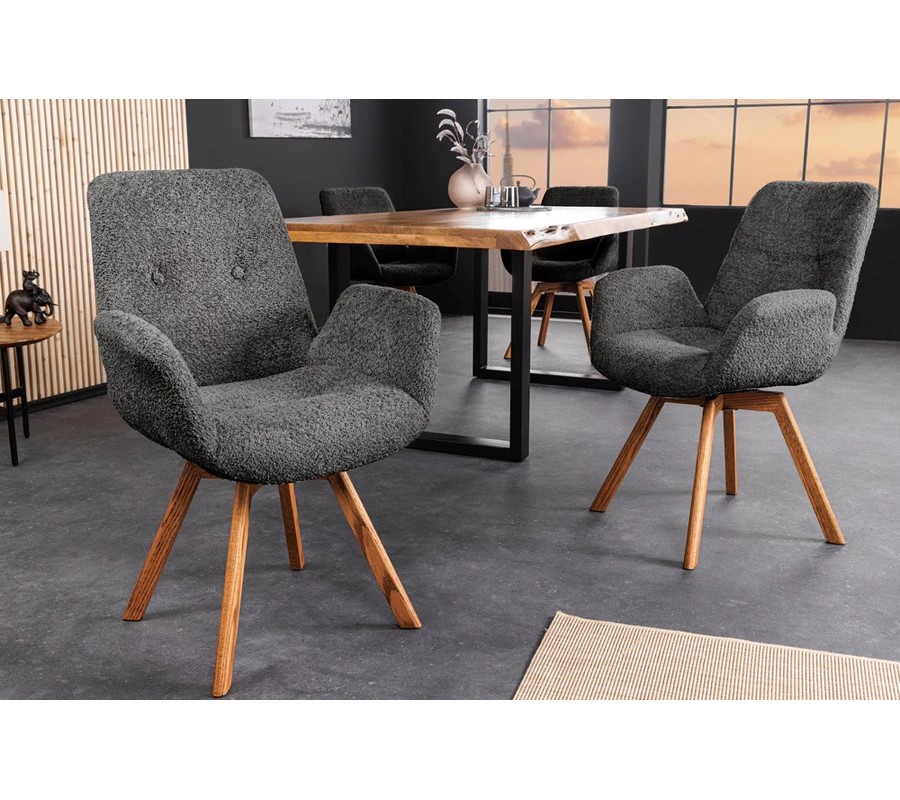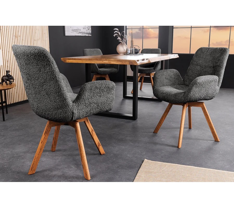 Dizajnová moderná otočná jedálenská stolička Gothenborg so sivým buklé čalúnením a hnedými dubovými nohami 61 cm