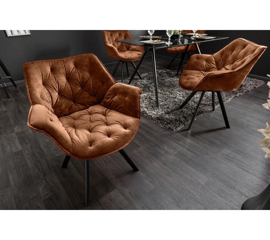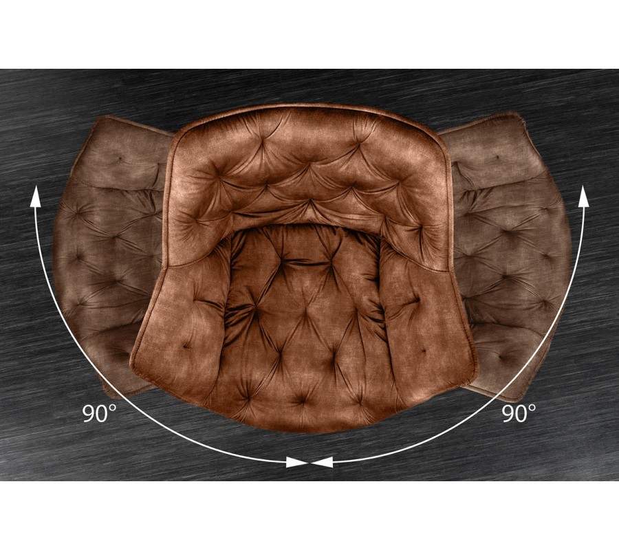 Dominantnou časťou je jej priestranná, komfortná sedacia časť s mäkkým chesterfield čalúnením. Toto dekoratívne prešívanie vytvára elegantnú plastickú štruktúru, ktorá dodáva stoličke vizuálne bohatý a sofistikovaný vzhľad. Pod sedacou časťou sa nachádza mechanizmus, ktorý umožňuje otočenie o 180°, čo zvyšuje praktickosť pri stolovaní aj bežnom každodennom používaní.