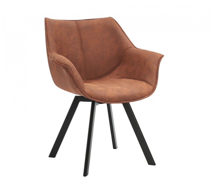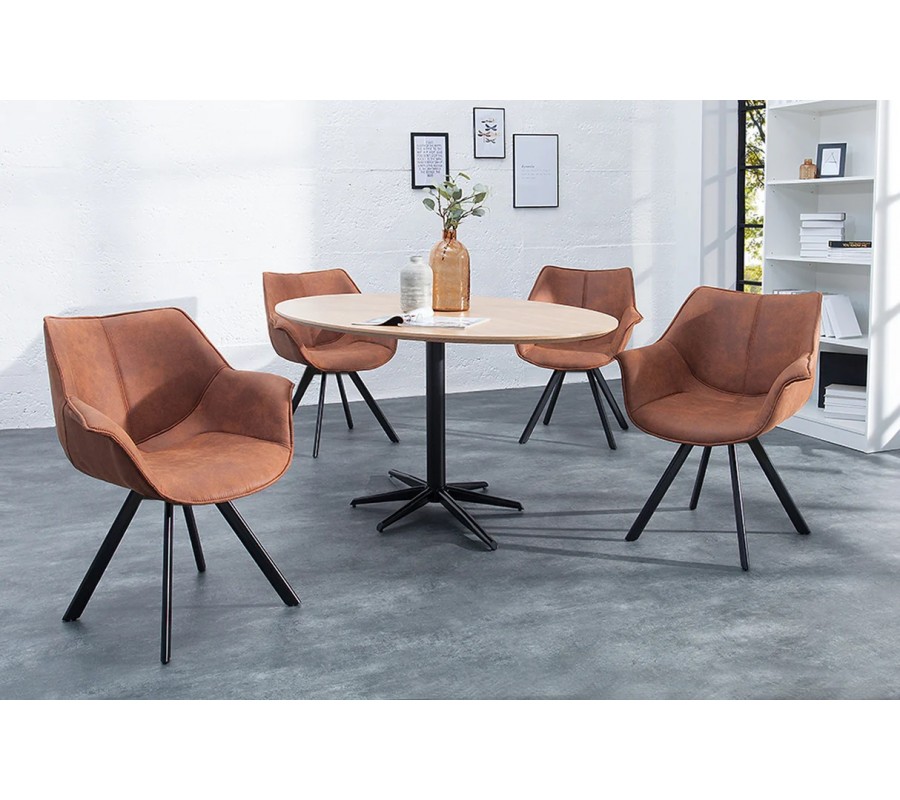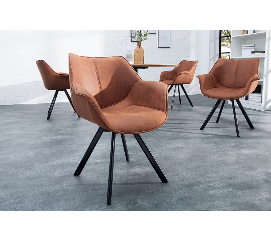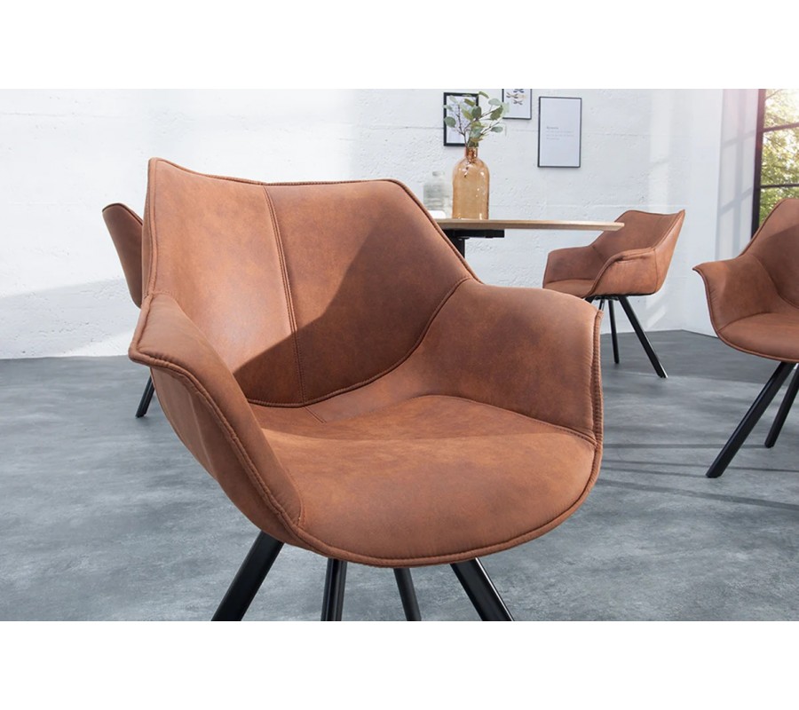Stolička má mierne vytočené bočné opierky smerom von, ktoré pôsobia uvoľnene a zároveň poskytujú komfortnú oporu. Praktickou funkciou je otočný mechanizmus o 180°, ktorý zvyšuje flexibilitu pri používaní pri jedálenskom stole aj pri dlhšom sedení. Stabilitu zabezpečujú čierne kovové nožičky, ktoré sú ploché, hranaté a mierne vyosené, pričom vychádzajú zo stredu pod sedadlom. Tento detail vytvára výrazný industriálny kontrast k teplému vintage hnedému čalúneniu.