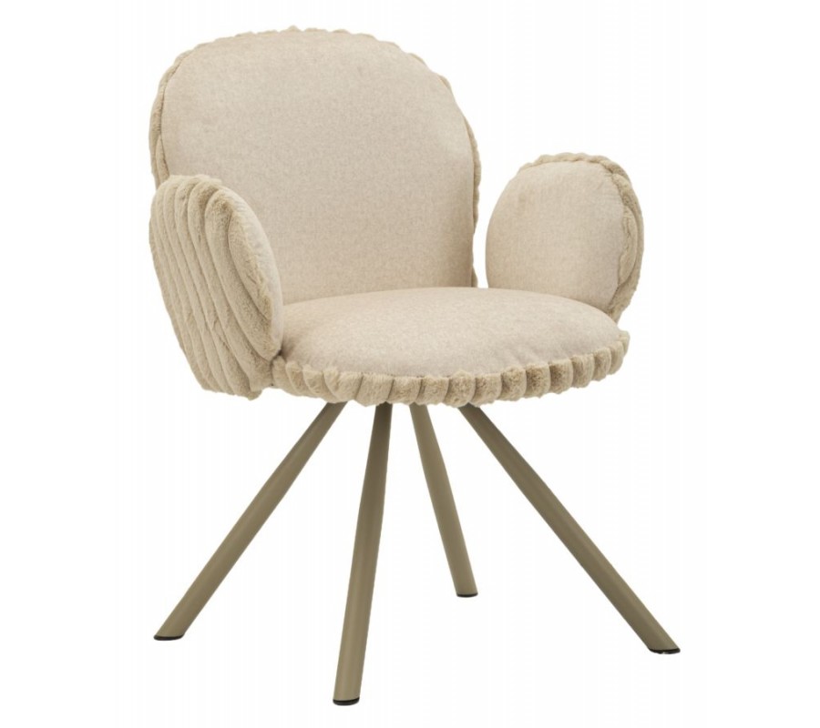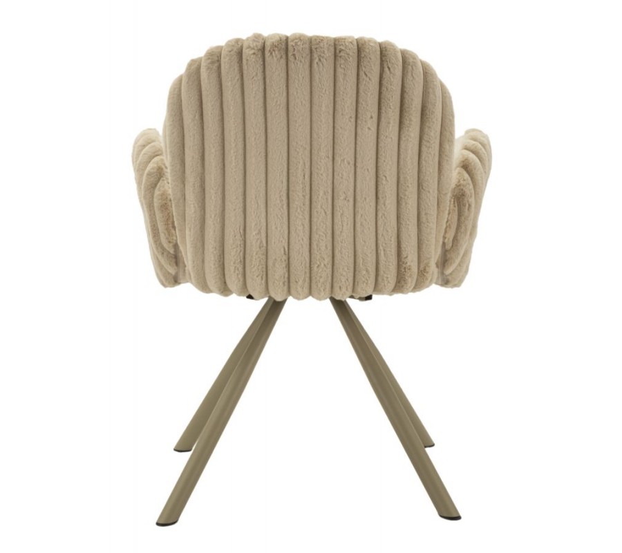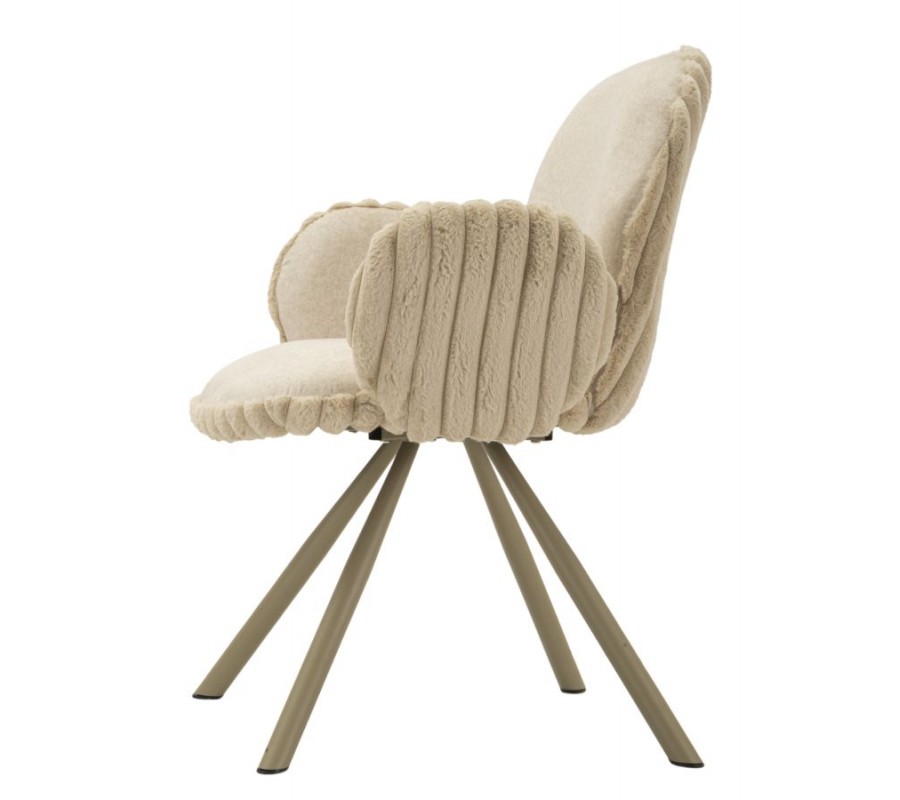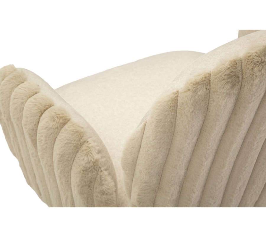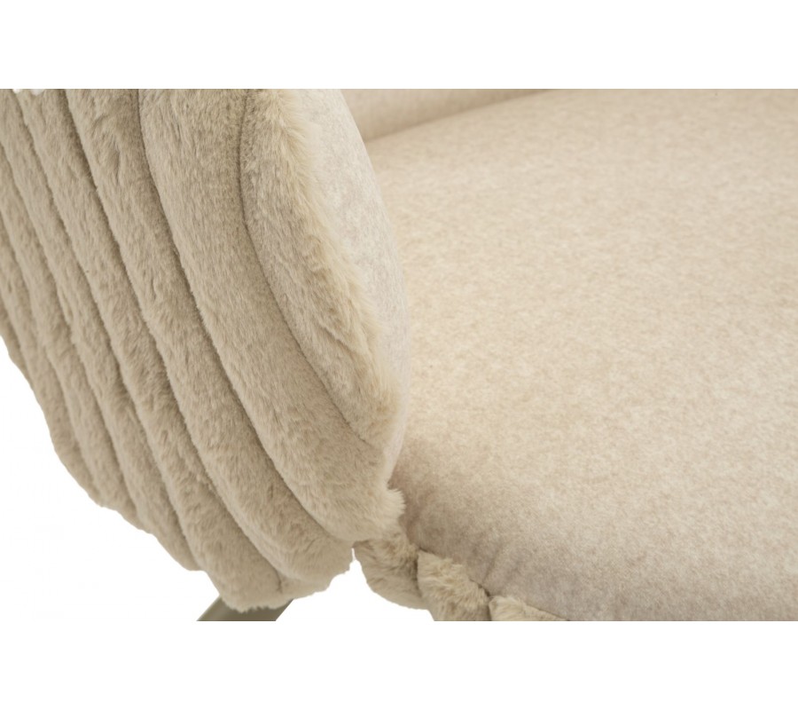 Stolička je čalúnená hebkým plyšovým poťahom v béžovom odtieni, ktorý prináša vysoký komfort pri sedení a zároveň vizuálnu mäkkosť. Na sedadle a vo vnútornej časti operadla má poťah nižší, jemný vlas, príjemný na dotyk a praktický na každodenné používanie. Zadná časť operadla je potiahnutá plyšom s vyšším vlasom, pripomínajúcim kožušinu, čo vytvára jemný kontrast textúr a dodáva stoličke sofistikovaný vizuálny detail. Zadná časť operadla a bočných opierok je navyše zdobená dekoratívnym vrúbkovaným prešívaním, ktoré stoličke dodáva decentný dizajnový akcent.