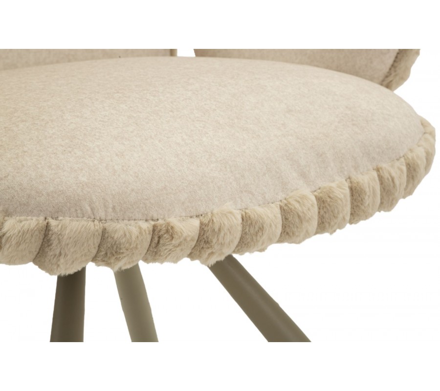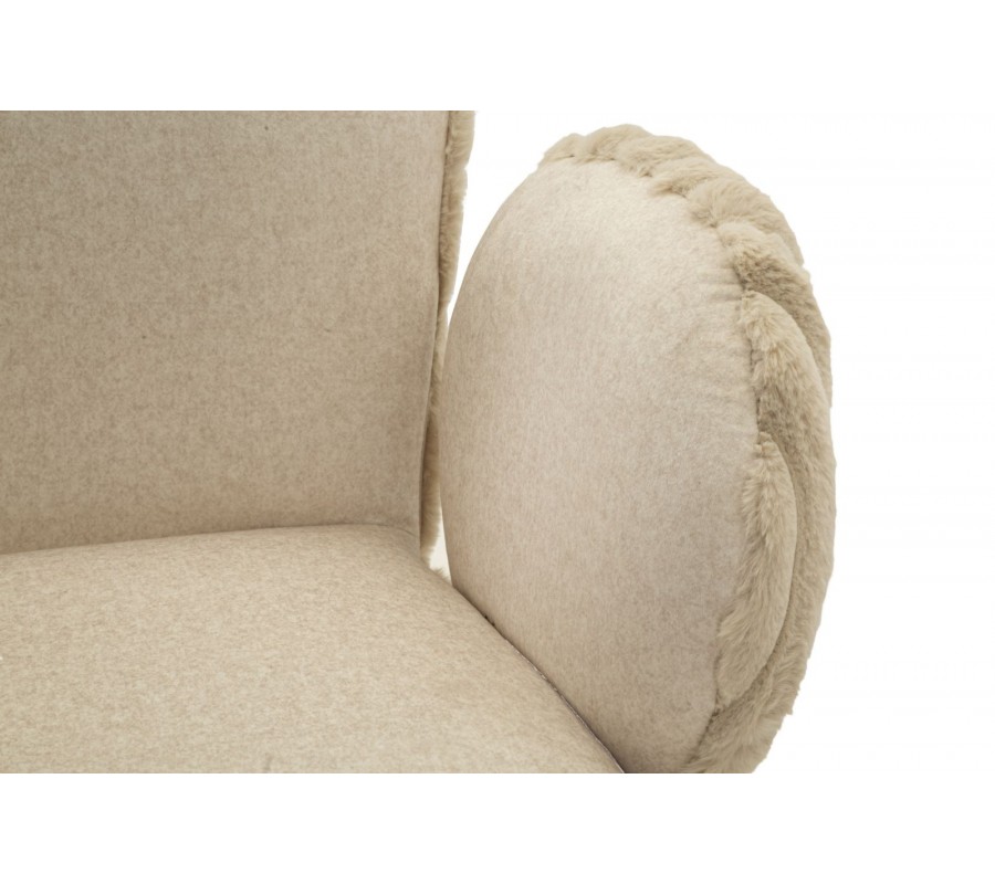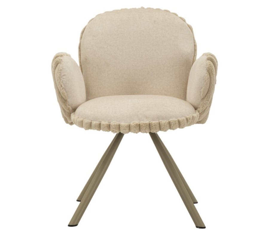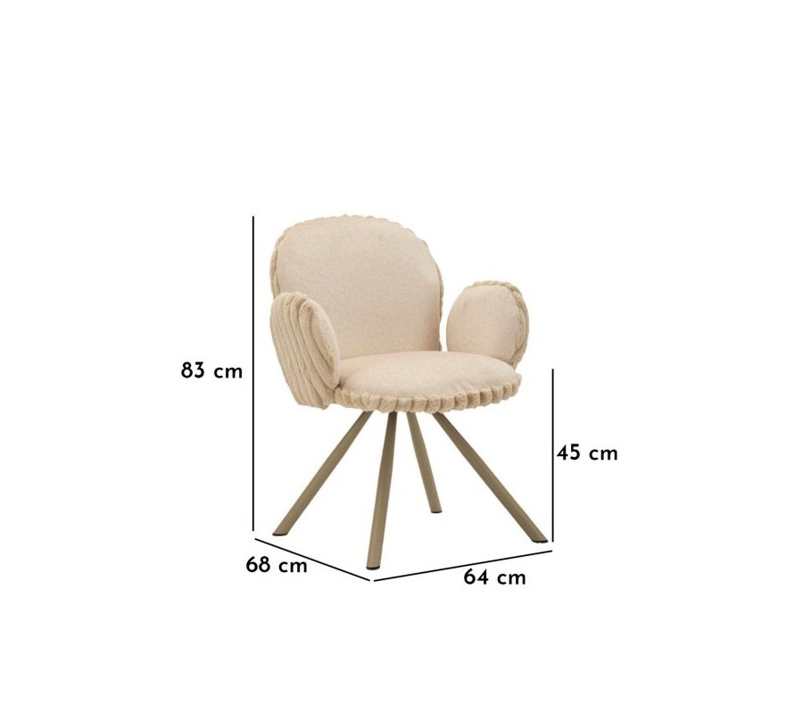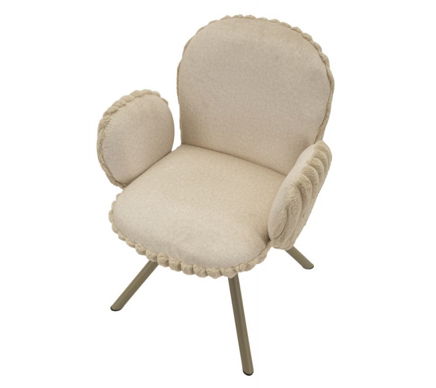 Stolička je čalúnená hebkým plyšovým poťahom v béžovom odtieni, ktorý prináša vysoký komfort pri sedení a zároveň vizuálnu mäkkosť. Na sedadle a vo vnútornej časti operadla má poťah nižší, jemný vlas, príjemný na dotyk a praktický na každodenné používanie. Zadná časť operadla je potiahnutá plyšom s vyšším vlasom, pripomínajúcim kožušinu, čo vytvára jemný kontrast textúr a dodáva stoličke sofistikovaný vizuálny detail. Zadná časť operadla a bočných opierok je navyše zdobená dekoratívnym vrúbkovaným prešívaním, ktoré stoličke dodáva decentný dizajnový akcent.