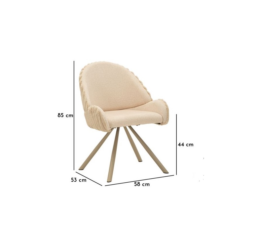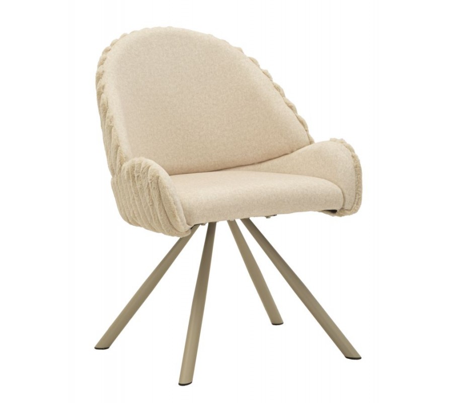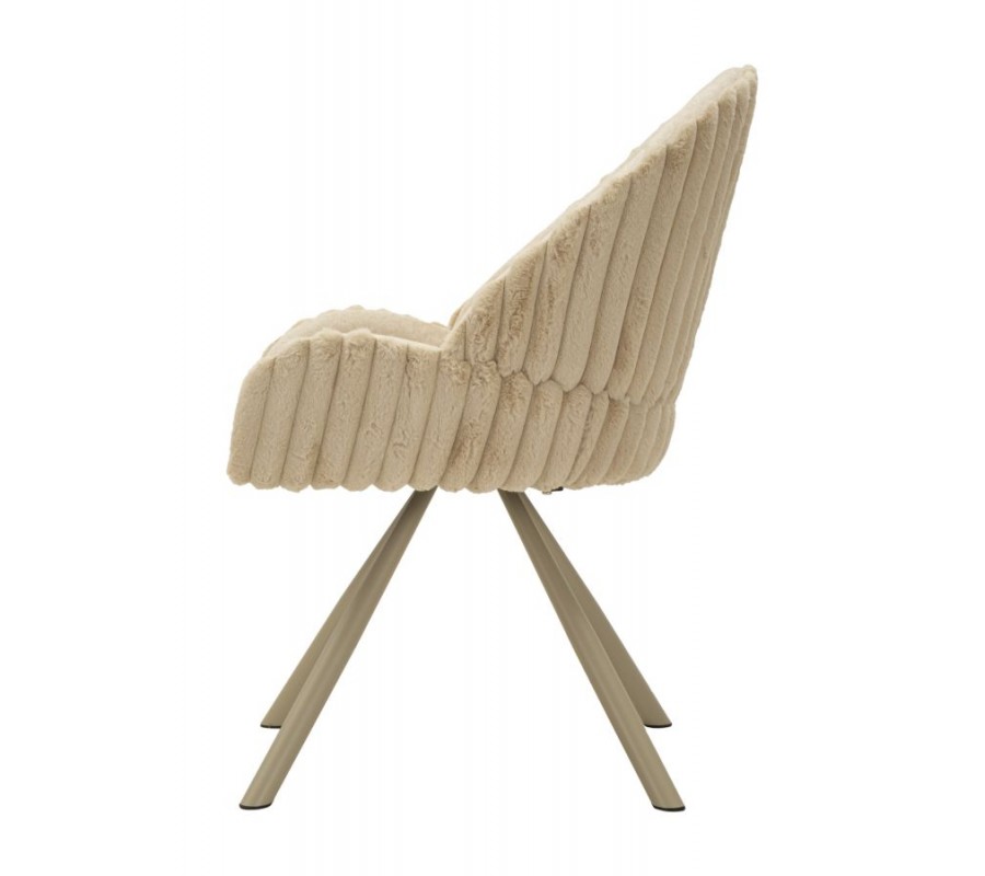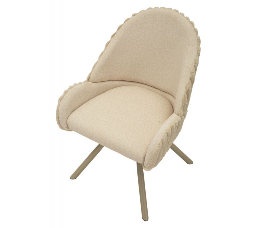 Stolička je potiahnutá hebkým plyšovým poťahom v krémovo bielom odtieni, ktorý pôsobí luxusne a zároveň útulne. Na sedadle a vo vnútornej časti operadla má poťah nižší, jemný vlas, ktorý je príjemný na dotyk a praktický na každodenné používanie. Zadná strana operadla je čalúnená plyšom s vyšším vlasom, pripomínajúcim kožušinu, čo vytvára atraktívny kontrast textúr a dodáva stoličke prémiový vzhľad. Zadnú časť operadla dopĺňa dekoratívne vrúbkované prešívanie, ktoré zvýrazňuje jej dizajnový charakter.