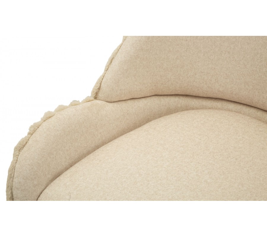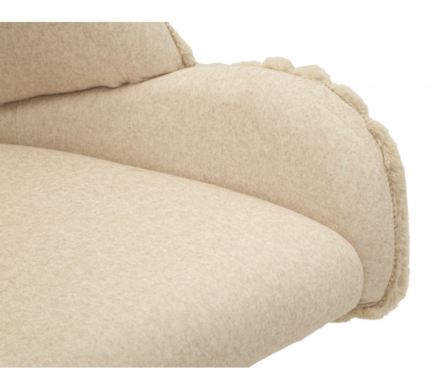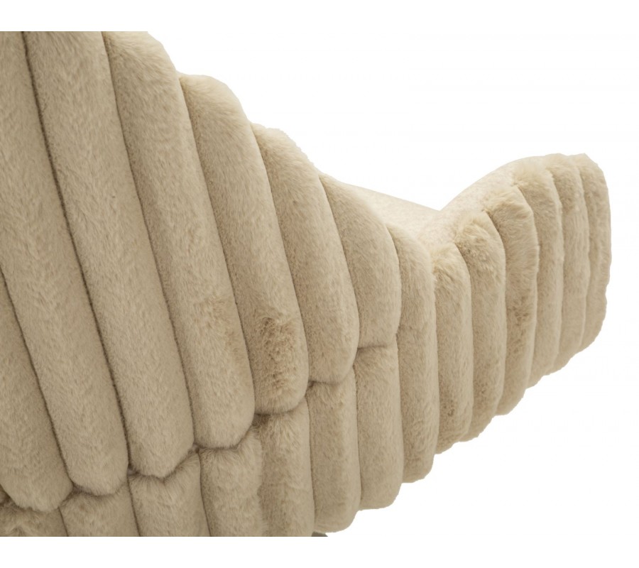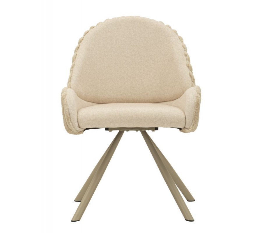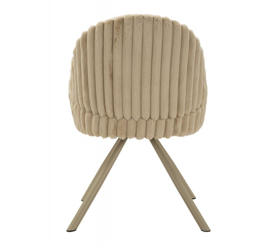 Stolička je potiahnutá hebkým plyšovým poťahom v krémovo bielom odtieni, ktorý pôsobí luxusne a zároveň útulne. Na sedadle a vo vnútornej časti operadla má poťah nižší, jemný vlas, ktorý je príjemný na dotyk a praktický na každodenné používanie. Zadná strana operadla je čalúnená plyšom s vyšším vlasom, pripomínajúcim kožušinu, čo vytvára atraktívny kontrast textúr a dodáva stoličke prémiový vzhľad. Zadnú časť operadla dopĺňa dekoratívne vrúbkované prešívanie, ktoré zvýrazňuje jej dizajnový charakter.