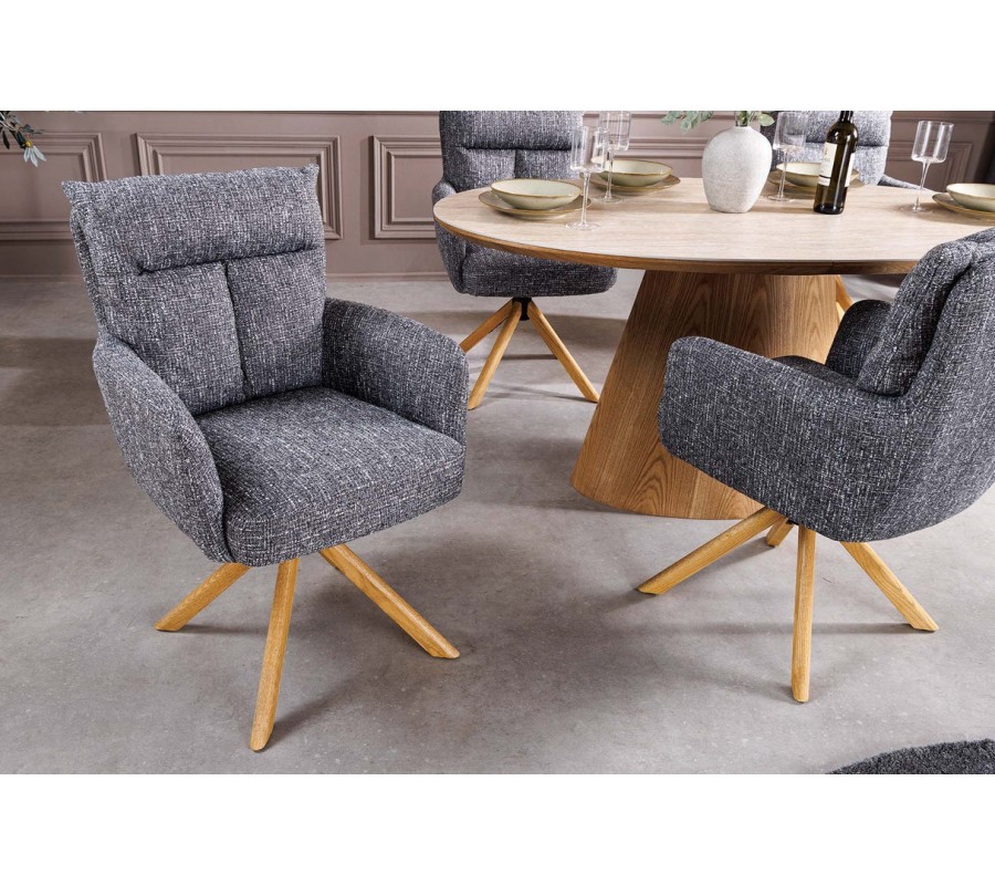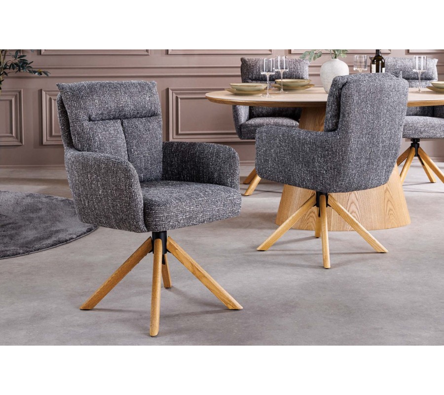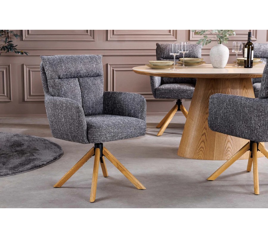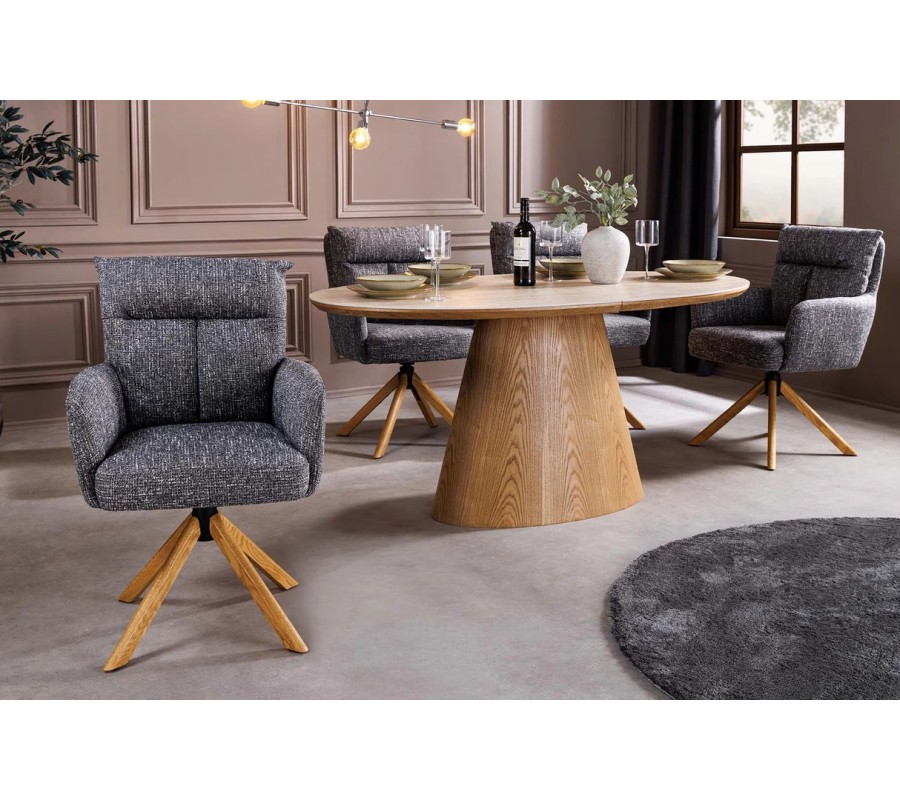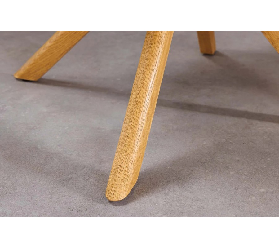 Moderná otočná čalúnená jedálenská stolička Dover spája pohodlie, funkčnosť a nadčasový dizajn s jemným retro nádychom. Stolička stojí na stabilnej štvorramennej podnoži z masívneho dubového dreva v teplom dubovo hnedom odtieni, pričom nožičky vychádzajú zo stredu pod sedadlom a vytvárajú ľahký, vzdušný vizuál. Otočný mechanizmus umožňuje otáčanie o 360 stupňov, čo zvyšuje komfort pri sedení pri jedálenskom stole aj v pracovnom priestore.