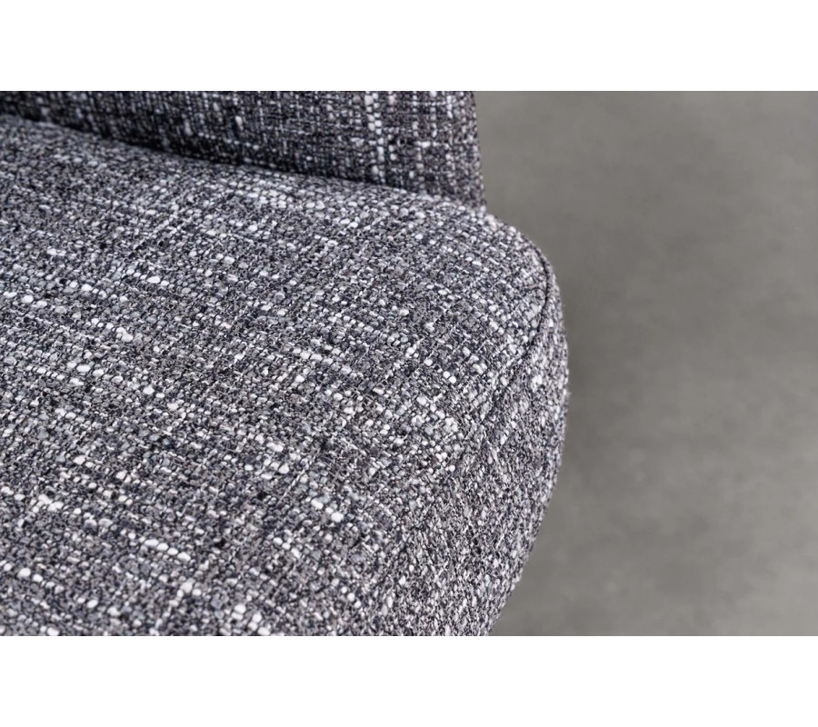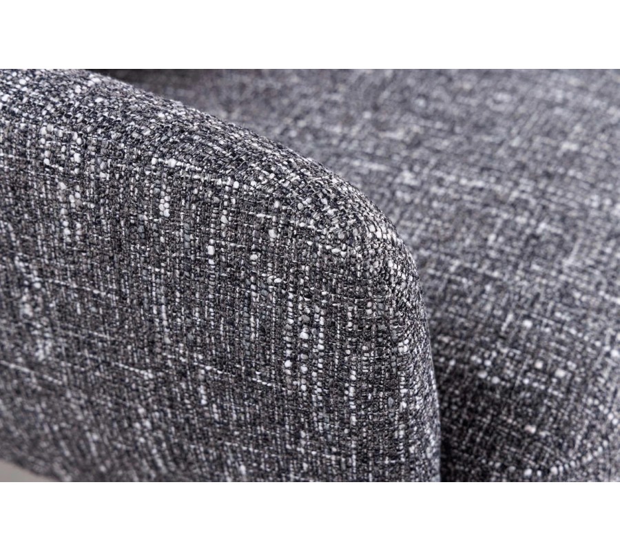 Sedadlo je čalúnené melírovaným ženilkovým poťahom v elegantnej sivo-bielej farebnosti, ktorý pôsobí moderne, jemne a je príjemný na dotyk. Užšie bočné opierky plynule prechádzajú do opierky chrbta a spolu vytvárajú kompaktný, ergonomicky tvarovaný celok. Chrbtová opierka je doplnená samostatným štvorcovým vankúšom, ktorý je pevne pripevnený k opierke chrbta, čím poskytuje dodatočnú oporu a zvyšuje komfort aj pri dlhšom sedení.