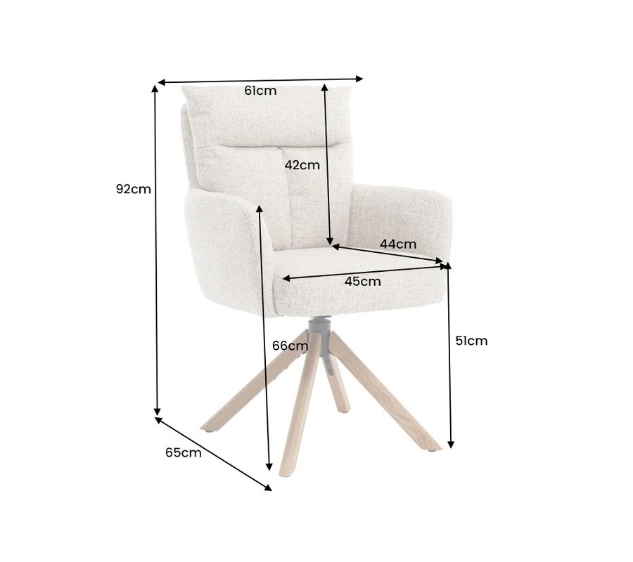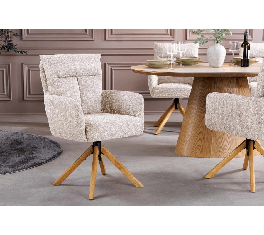 Moderná otočná čalúnená jedálenská stolička Dover v béžovom prevedení spája nadčasový dizajn, vysoký komfort a praktickú funkčnosť. Stolička stojí na stabilnej štvorramennej podnoži z masívneho dubového dreva v teplom hnedom odtieni, pričom nožičky vychádzajú zo stredu pod sedadlom a dodávajú celku ľahký, jemne retro charakter. Otočný mechanizmus umožňuje otáčanie o 360 stupňov a zároveň zabezpečuje automatický návrat sedadla do pôvodnej polohy, čo je mimoriadne praktické pri používaní v jedálni.