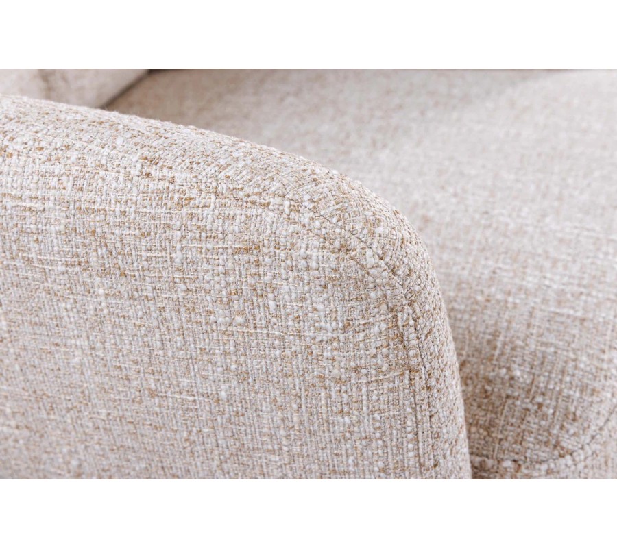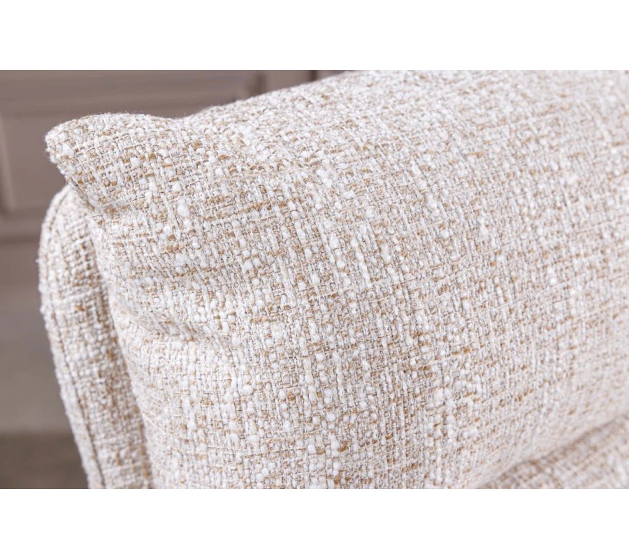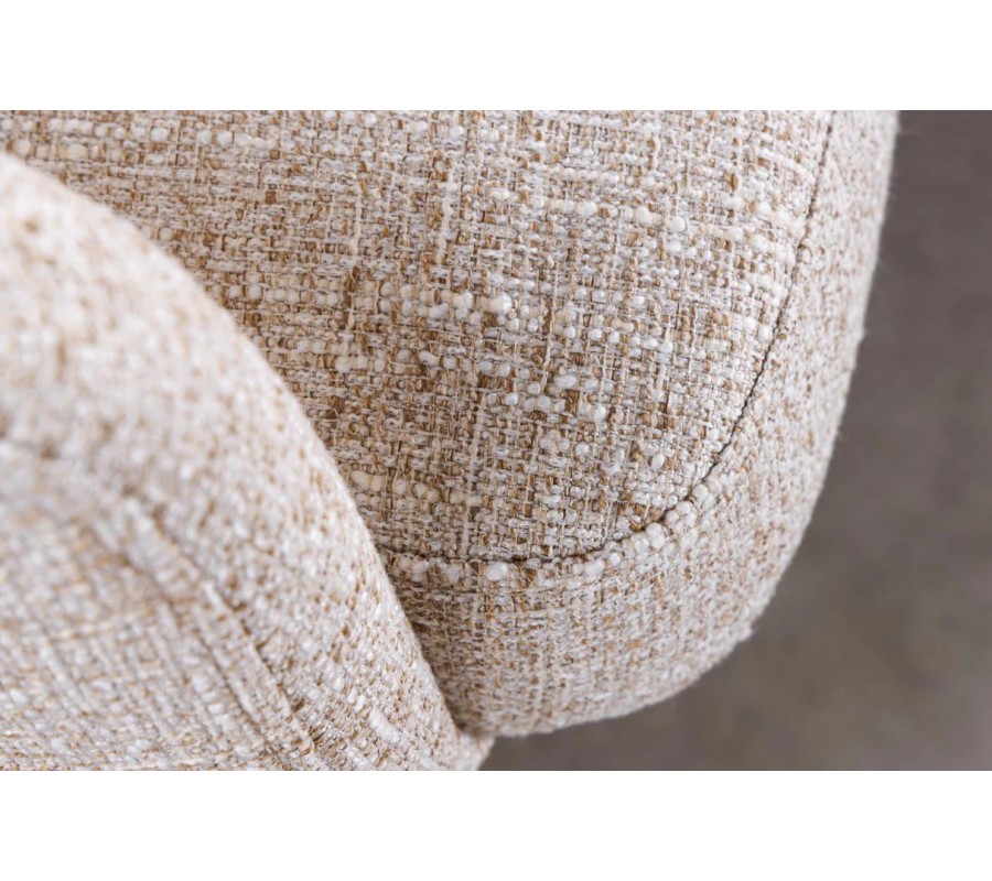 Sedadlo je čalúnené a potiahnuté kvalitnou ženilkovou látkou v jemnom béžovom odtieni, ktorá pôsobí elegantne, je príjemná na dotyk a ľahko sa kombinuje s ostatným zariadením interiéru. Užšie bočné opierky plynulo nadväzujú na opierku chrbta a vytvárajú kompaktný, ergonomicky tvarovaný celok. Chrbtová opierka je doplnená štvorcovým vankúšom, ktorý je pevne pripevnený k opierke, poskytuje dodatočnú oporu a zvyšuje komfort aj pri dlhšom sedení.