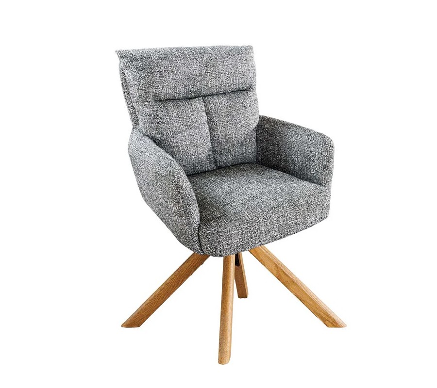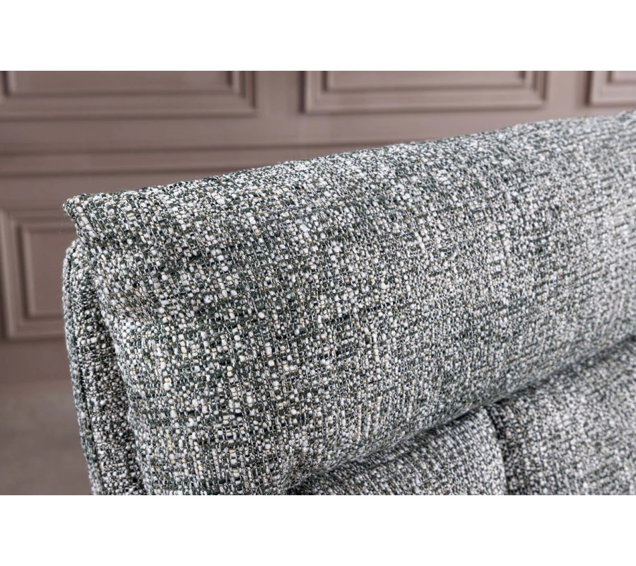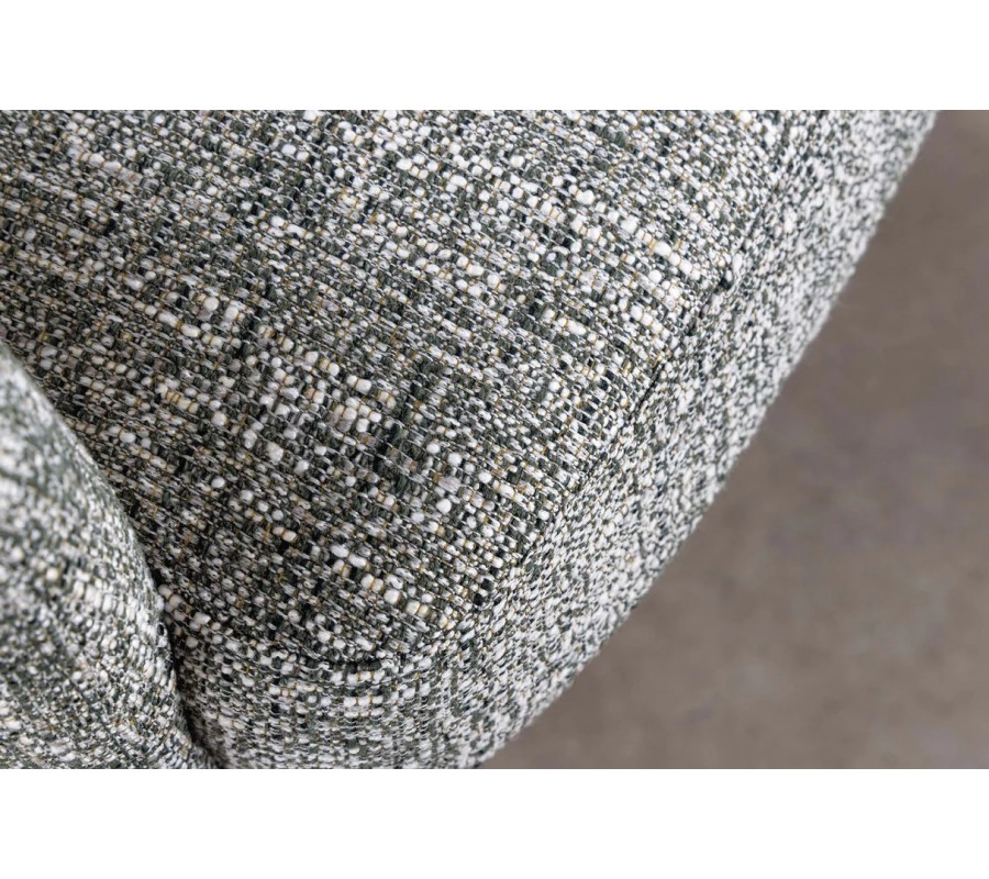 Sedadlo je čalúnené melírovanou ženilkovou látkou v elegantnom sivozelenom tóne, ktorý pôsobí sviežo, prirodzene a je príjemný na dotyk. Užšie bočné opierky plynulo nadväzujú na opierku chrbta a vytvárajú kompaktný, ergonomicky tvarovaný celok. Chrbtová opierka je doplnená štvorcovým vankúšom, ktorý je pevne upevnený k opierke chrbta, poskytuje dodatočnú oporu a zvyšuje komfort aj pri dlhšom sedení.