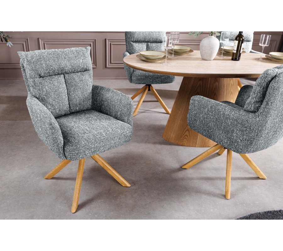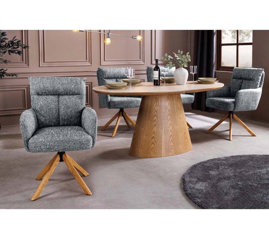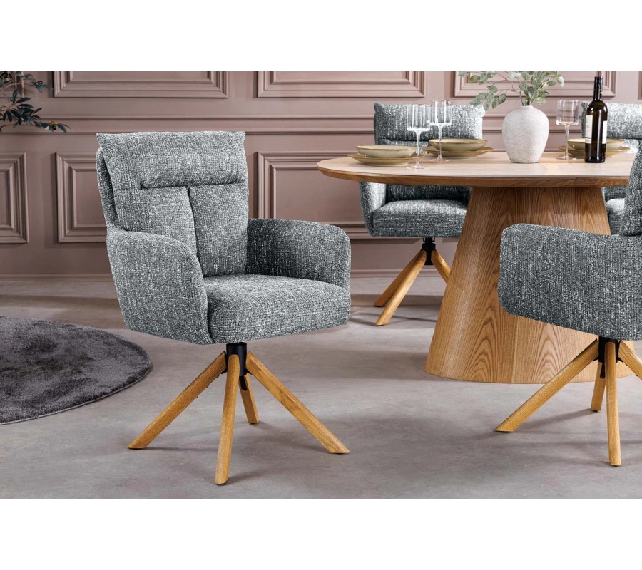 Moderná otočná čalúnená jedálenská stolička Dover v svetlom sivozelenom melírovanom prevedení je ideálnou kombináciou komfortu, funkčnosti a nadčasového dizajnu. Stolička je osadená na stabilnej štvorramennej podnoži z masívneho dubového dreva v hnedom odtieni, pričom nožičky vychádzajú zo stredu pod sedadlom a dodávajú celku jemný retro charakter. Otočný mechanizmus umožňuje otáčanie o 360 stupňov a zároveň zabezpečuje automatický návrat sedadla do pôvodnej polohy, čo oceníte najmä pri každodennom používaní v jedálni.