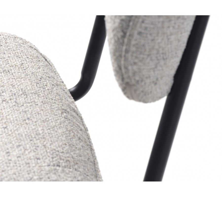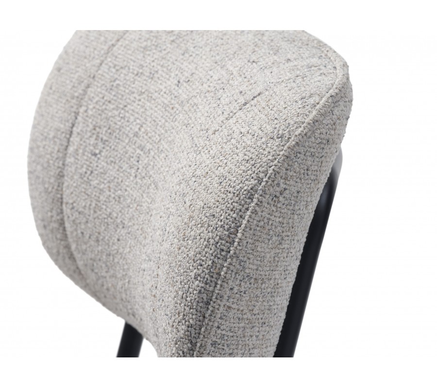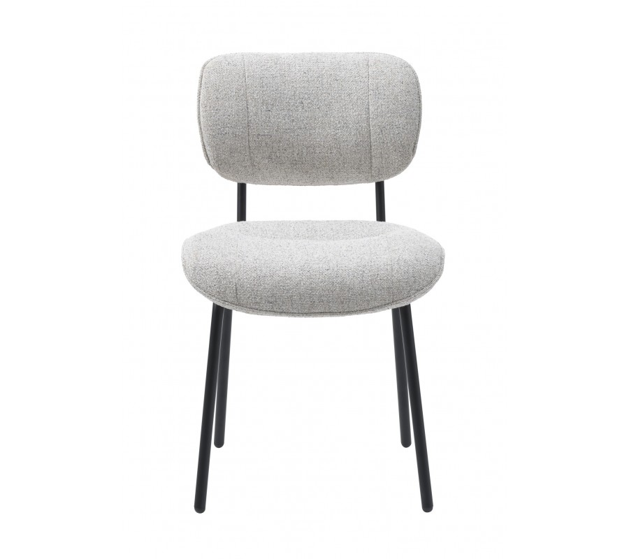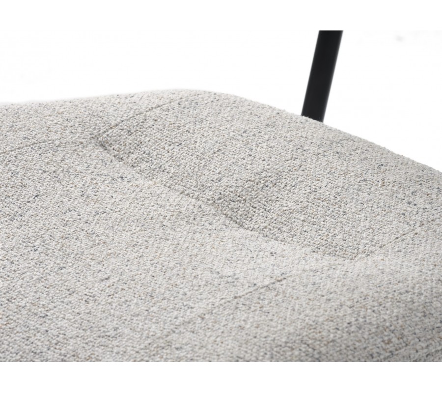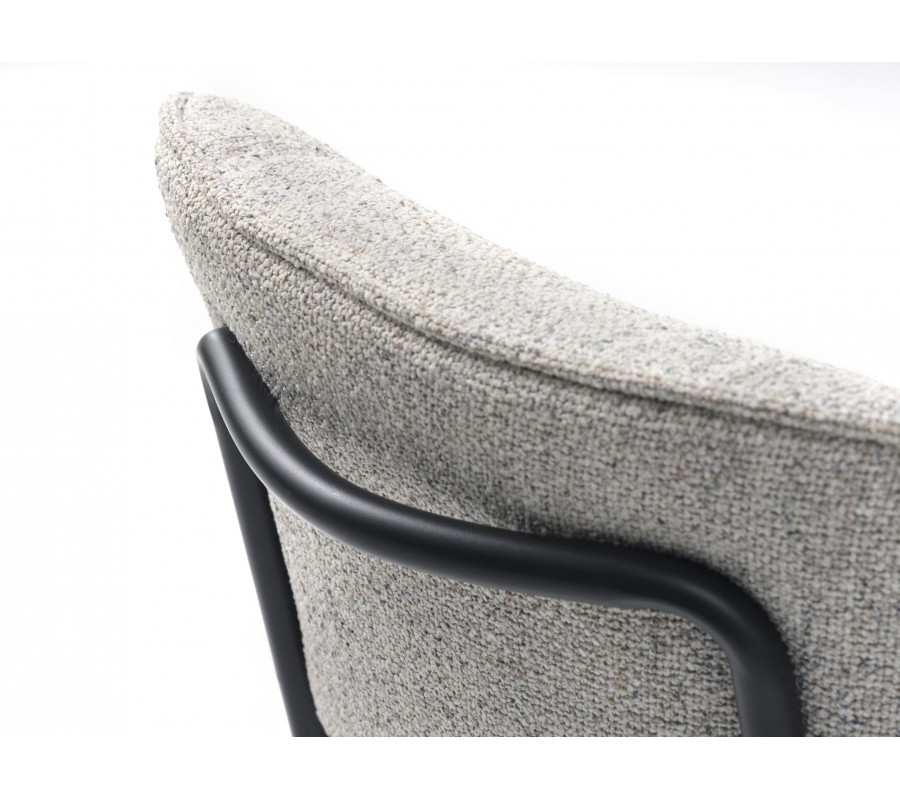 Sedadlo má výrazne zaoblený štvorcový tvar, ktorý je zároveň na bokoch vytiahnutý a vpredu zahnutý smerom dole, čím sa pri sedení dokonale prispôsobí telu. Dopĺňa ho minimalistické zdobenie v podobe jednej hlboko prešívanej a dvoch jemnejších línií. Chrbtová opierka je tiež ergonomicky tvarovaná do poloblúka a dopĺňajú ju dve jemnejšie prešívané línie, nadväzujúce na dizajn sedadla. Penová výplň poskytuje komfort aj pri dlhšom sedení. Poťah z buklé je príjemný na dotyk a pôsobí útulným teplým dojmom. Prevedenie v melírovanej bielosivej farbe krásne kontrastuje s dizajnom rámu.