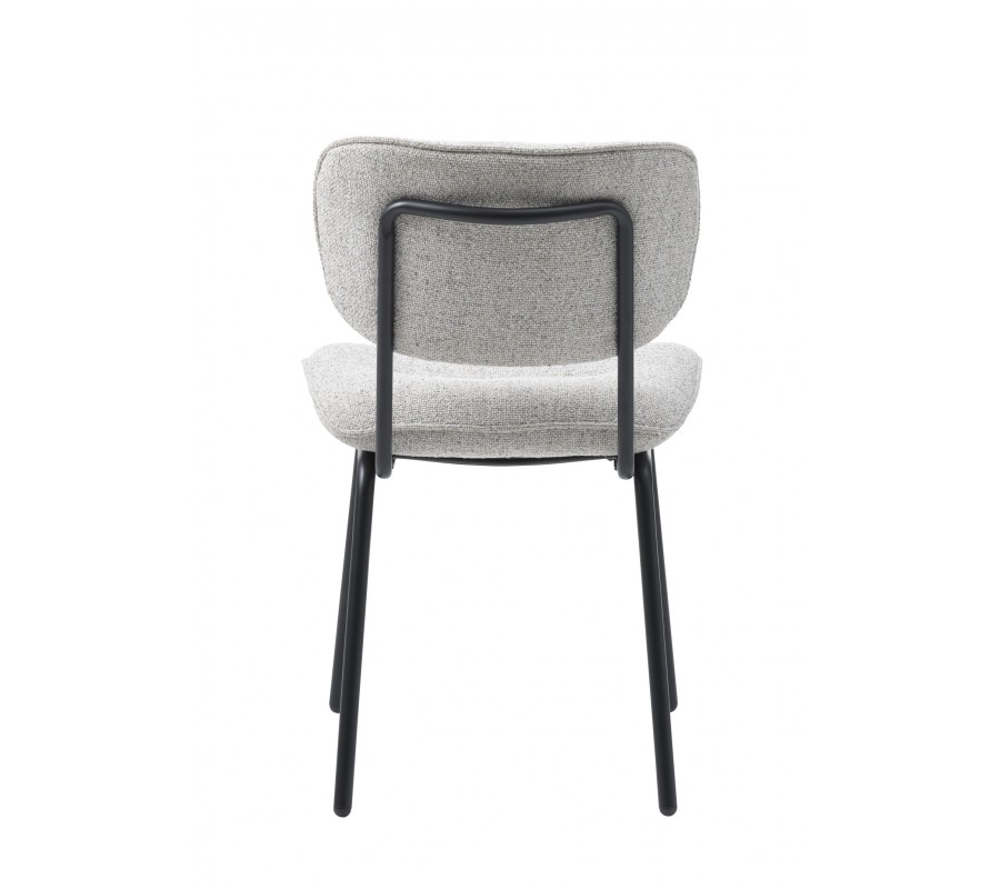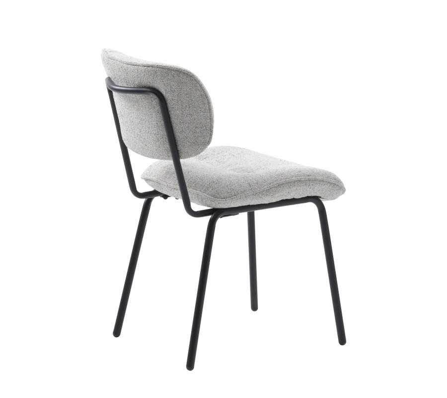 Stolička má odľahčenú a vzdušnú siluetu, ktorá zároveň poskytuje maximálny komfort. Nosná konštrukcia je vyrobená z kovu v matnom čiernom prevedení a jej štíhle línie so zaoblenými ohybmi vytvárajú plynulý elegantný vizuál. Predné a zadné nohy sú na bokoch prepojené výstuhou, ktorá poskytuje oporu pre sedadlo. Zo zadnej strany sú k nim diskrétne upevnené ďalšie dve ohnuté tyče, ktoré smerujú hore a stretávajú sa v obdĺžnikovom ráme, držiacom chrbtovú opierku.