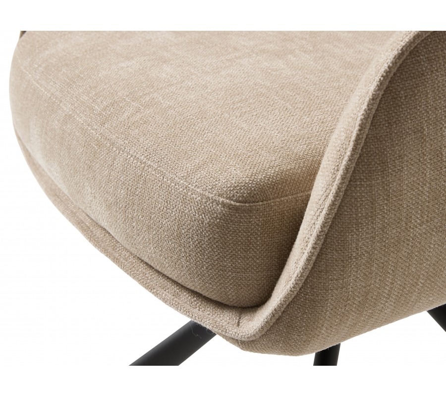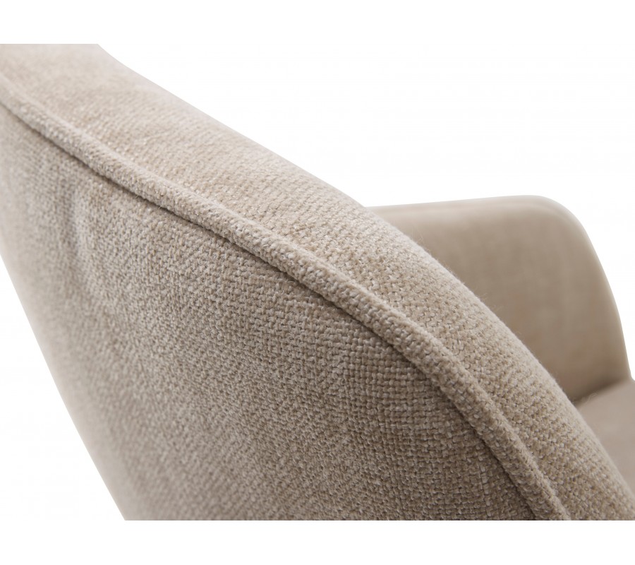 Poťah tvorí odolné mikrovlákno, ktoré si zachováva svoj vzhľad aj pri intenzívnom každodennom používaní. Látka má jemnú štruktúru so ženilkovým efektom, vďaka čomu je príjemná na dotyk. Béžová farba dodáva stoličke teplý charakter. Kovová podnož v čiernom prevedení vytvára kontrastný akcent s industriálnym nádychom.