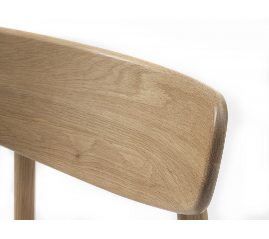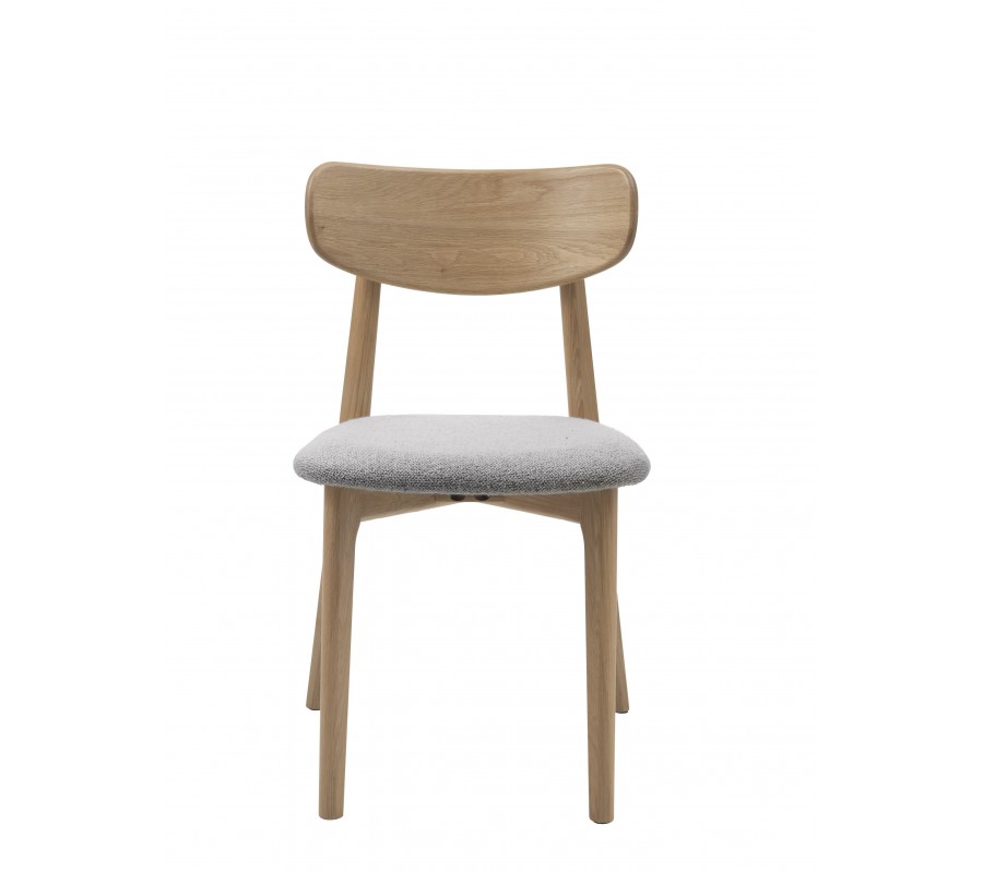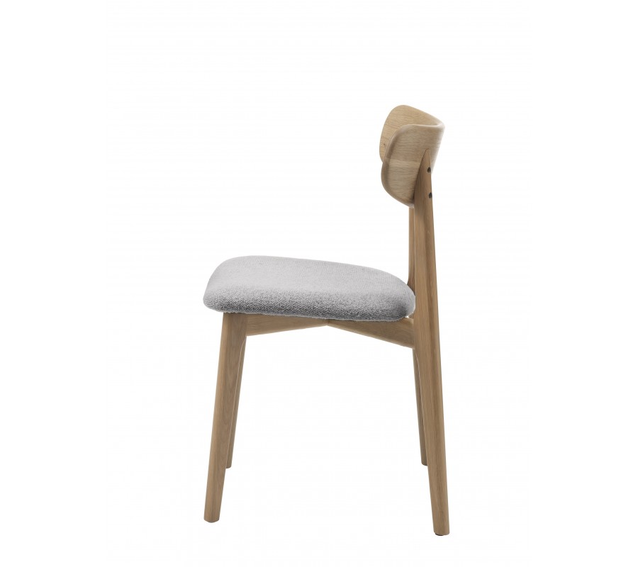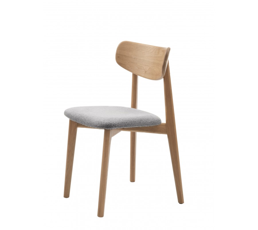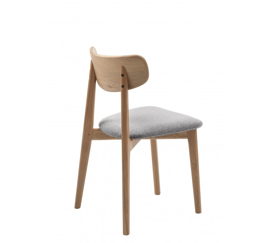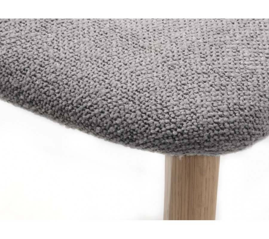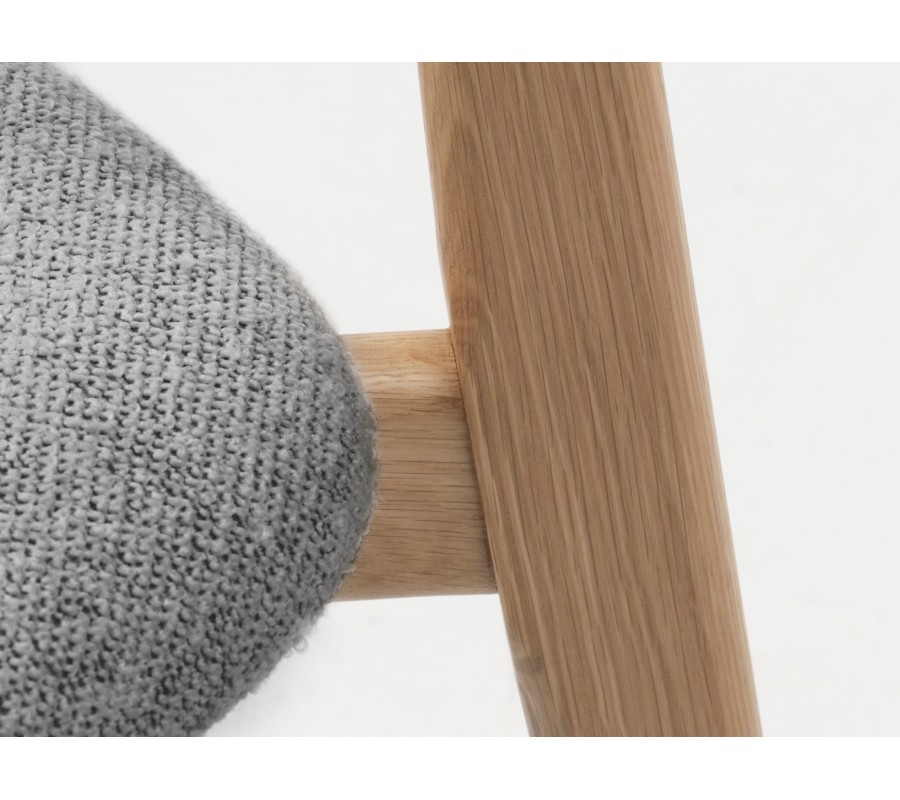 Konštrukcia stoličky pôsobí odľahčeným a vzdušným dojmom s nádychom retro štýlu, ktorý zdôrazňuje aj prevedenie v prírodnej svetlej hnedej farbe masívneho dubového dreva. Pravidelná kresba letokruhov zdôrazňuje prírodný vizuál. Sedadlo je čalúnené, s poťahom z buklé v svetlej sivej farbe. Má na dotyk príjemnú mäkkú štruktúru, ktorá pôsobí v kombinácii s neutrálnym odtieňom elegantne.