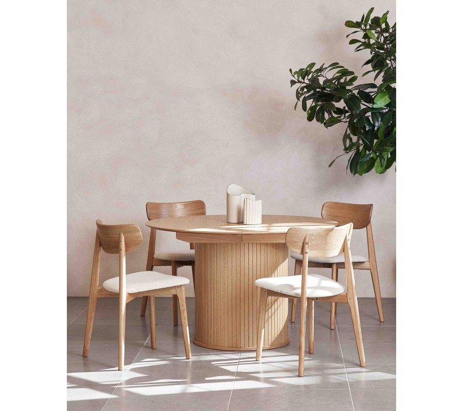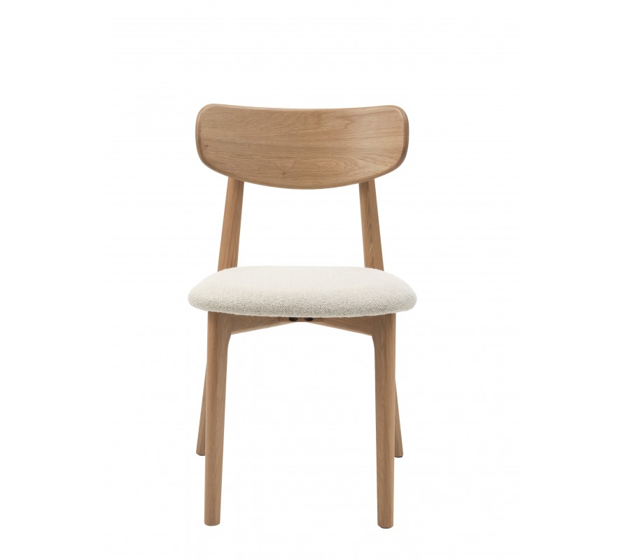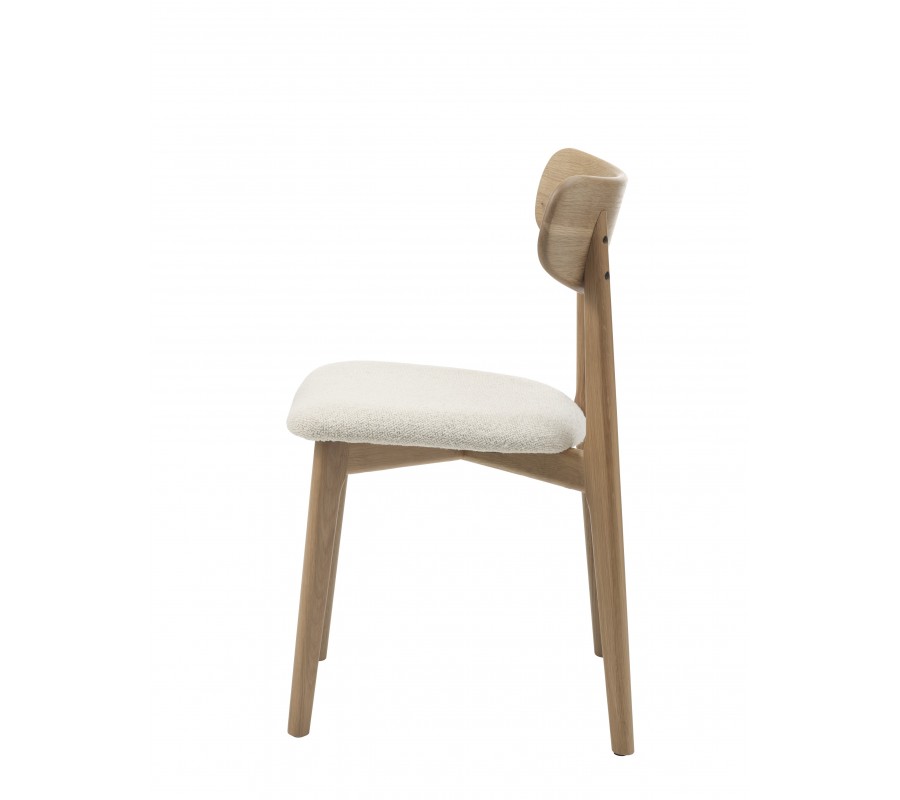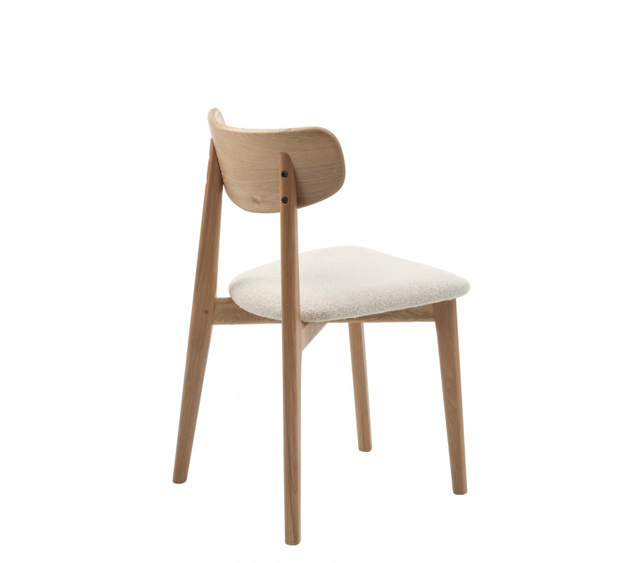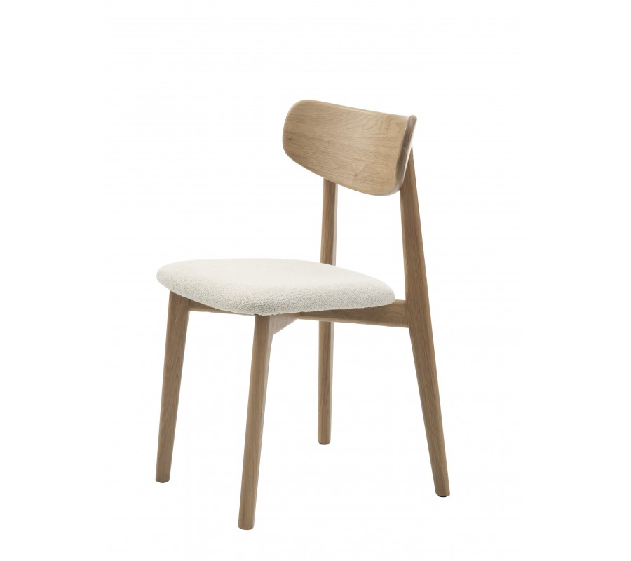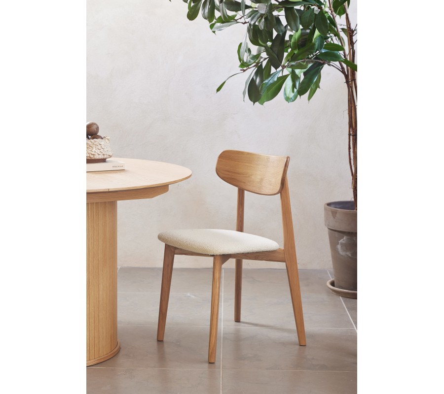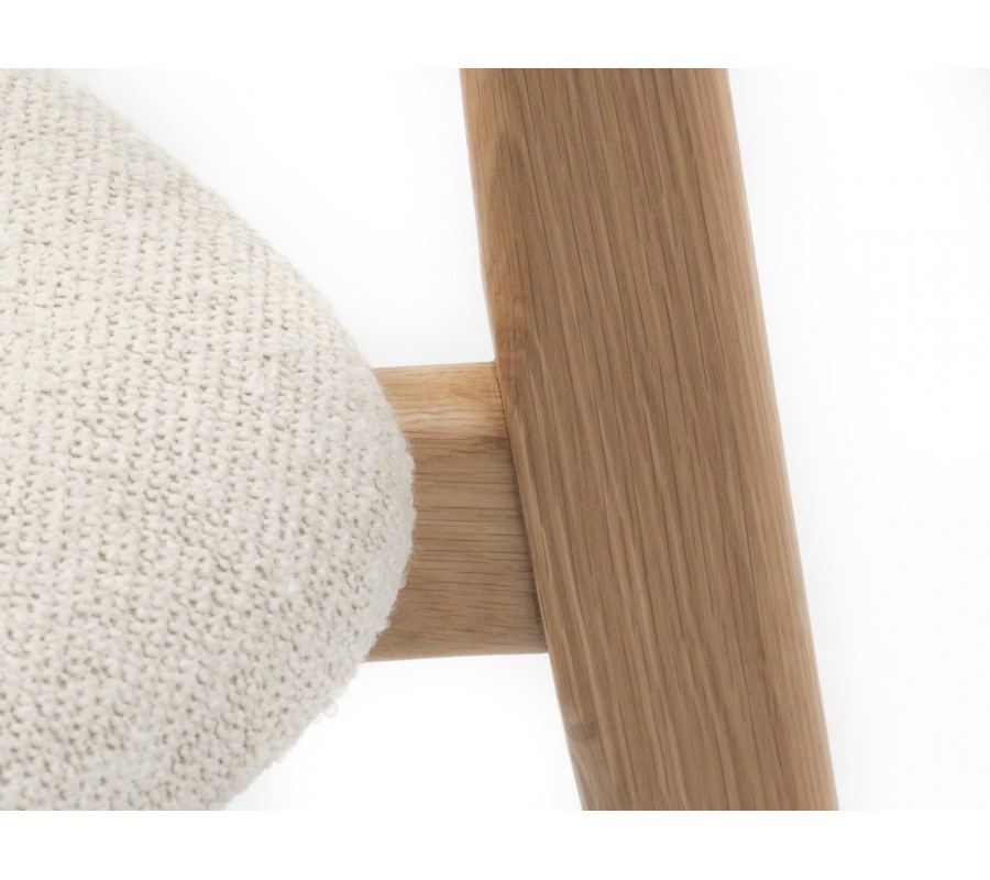 Použité materiály podčiarkujú jej prirodzený charakter – konštrukcia je vyrobená z masívneho dubového dreva v svetlom hnedom prírodnom odtieni, ktorého kresba letokruhov zvýrazňuje autentický prírodný vzhľad. Sedadlo je čalúnené mäkkou buklé látkou v bielej farbe, ktorá je príjemná na dotyk a pôsobí čistým sofistikovaným dojmom.