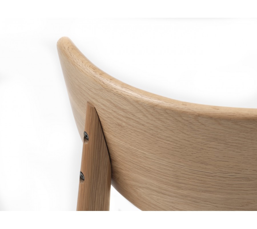 Nožičky majú valcovitý profil, ktorý sa smerom nadol jemne zužuje. Ich mierne šikmý profil prispieva k celkovej stabilite. Zadné nohy plynulo pokračujú až nad úroveň sedadla, kde sa napájajú na operadlo. To je ergonomicky zakrivené, aby poskytovalo pohodlnú oporu chrbtu, a jeho zaoblené línie dodávajú stoličke elegantný výraz.