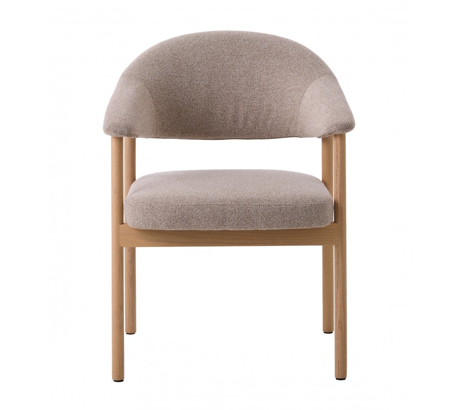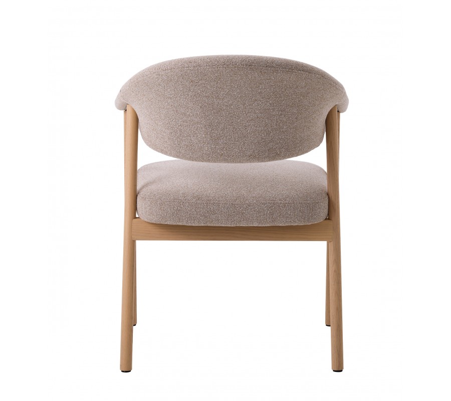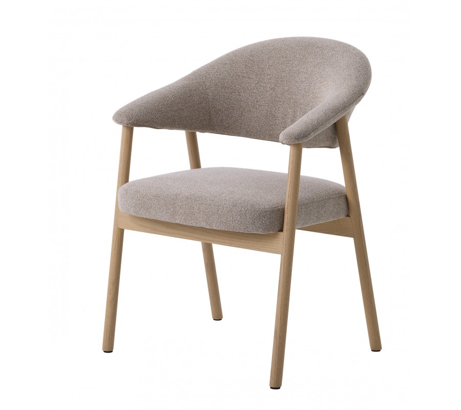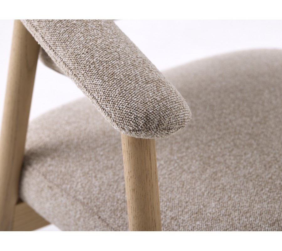 Sedadlo aj opierka sú čalúnené, s odolným poťahom z mikrovlákna. Jeho povrchová úprava s drobnými slučkami, ktoré je príjemná na dotyk a pôsobí bohatým dojmom. Textília v svetlej hnedej farbe prirodzene dopĺňa tóny dreva a pôsobí hrejivo.