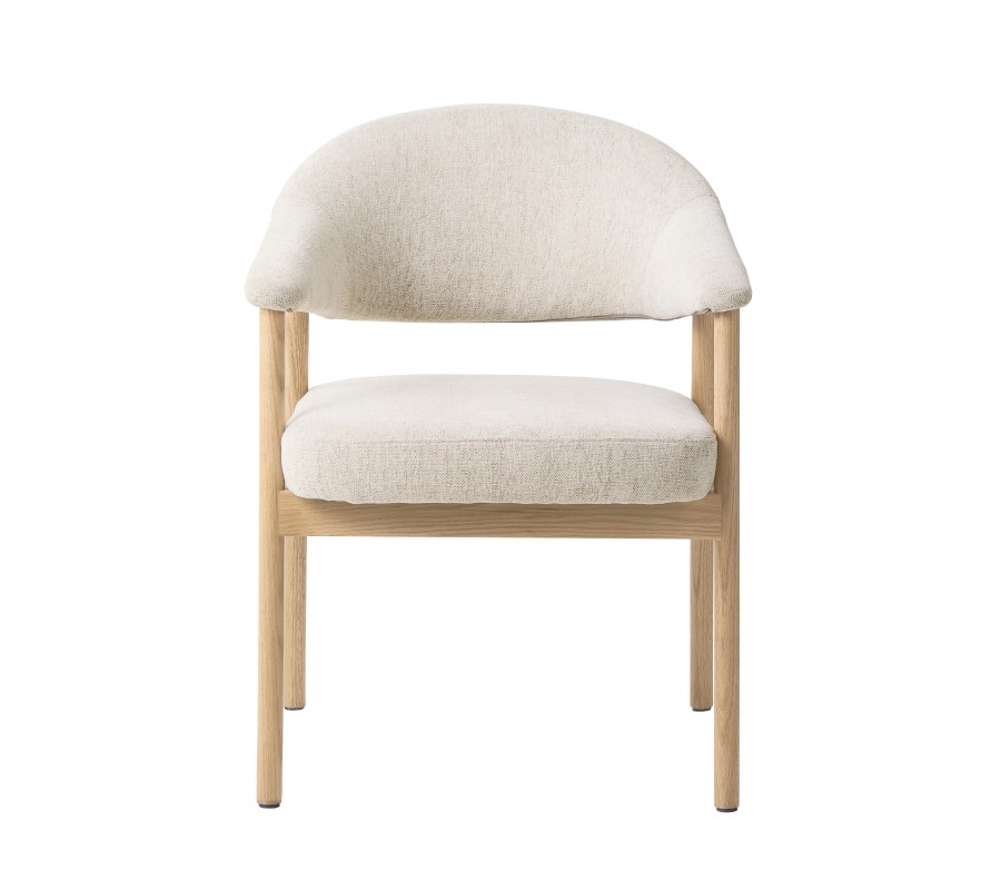 Konštrukcia je vyrobená z dreva vo svetlej hnedej farbe bieleného duba, ktorá v kombinácii s priznanou pravidelnou kresbou letokruhov podčiarkuje prírodný škandinávsky charakter dizajnu. Poťah s na dotyk príjemným ženilkovým finišom v svetlom krémovobielom odtieni krásne komplimentuje drevo a dodáva stoličke mäkký hrejivý výraz. Je vyrobený z mikrovlákna, vďaka ktorému je mimoriadne pevný, odolný a nenáročný na údržbu.