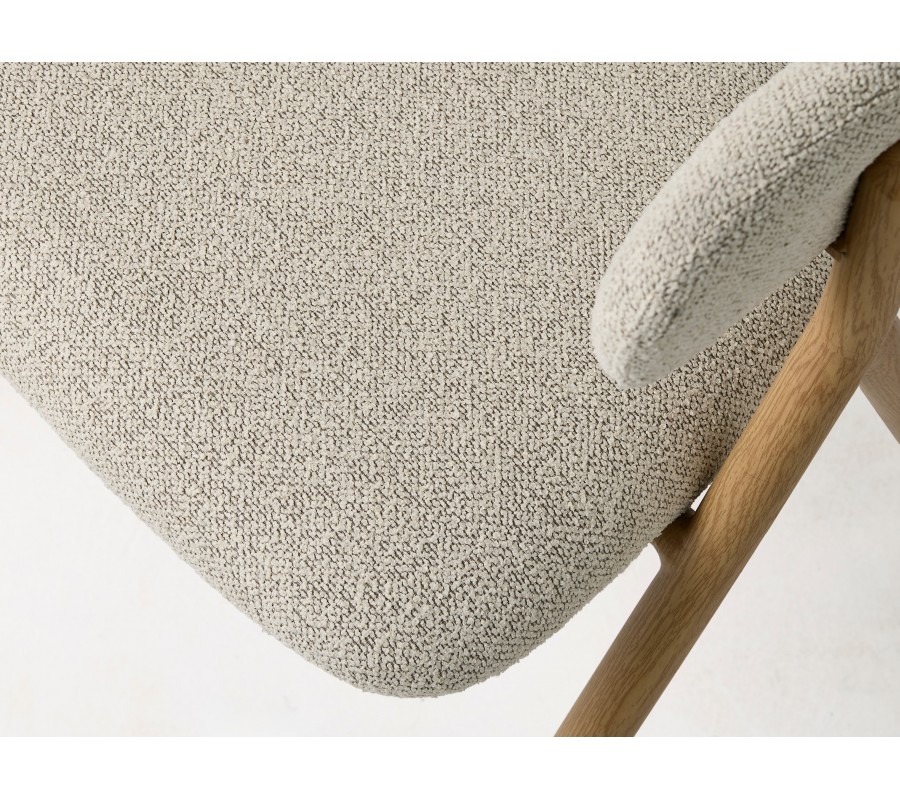 Stolička má obdĺžnikové sedadlo, ktoré v zadnej časti tvarované do poloblúka. Pokrýva ho mäkká penová výplň, zvyšujúca komfort pri sedení a poťah z mikrovlákna s vysokú odolnosťou voči vplyvom každodenného používania. Hladké tkanie textílie oživuje melírovaný efekt v bielo-béžovom prevedení. Poťah je príjemný na dotyk a pôsobí útulným dojmom.