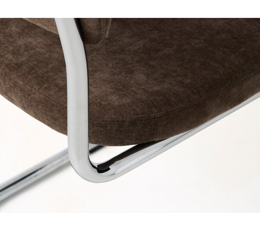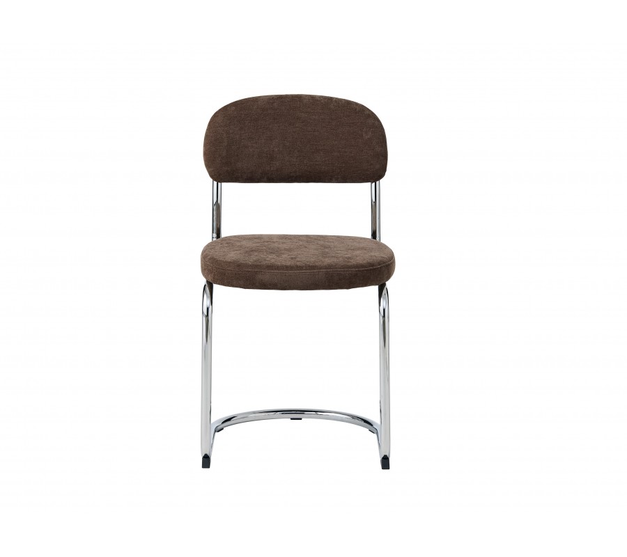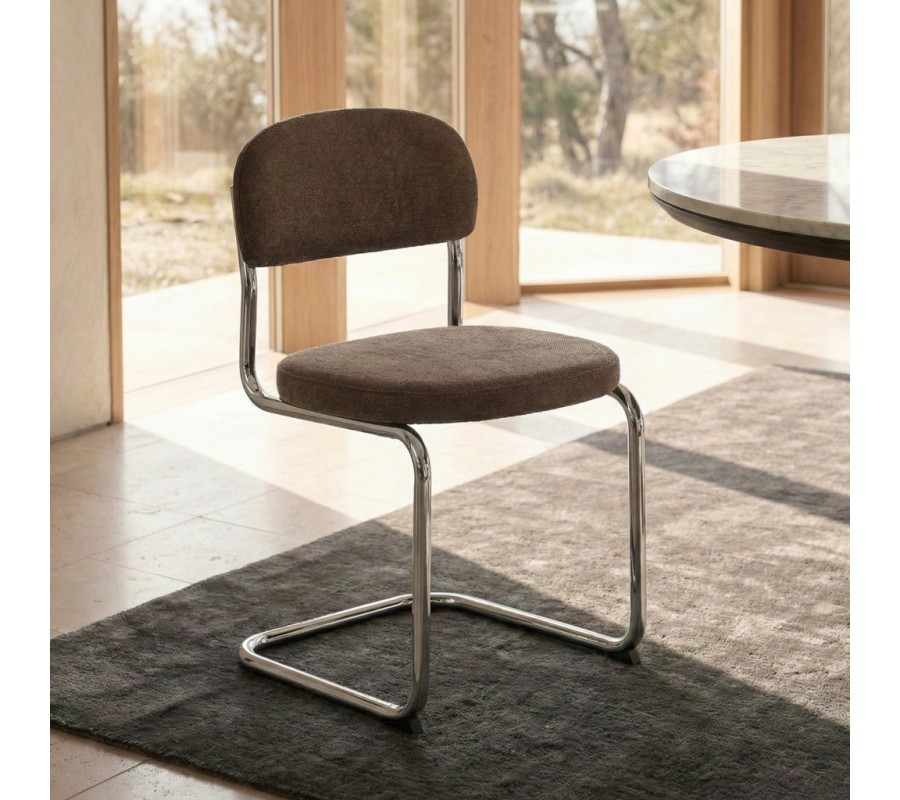 Konštrukcia stoličky je vyrobená z kovu v lesklom chrómovom prevedení. To pôsobí v kombinácii s konzolovým tvarom šarmantným retrofuturistickým dojmom. Poťah je vyrobený z odolného mikrovlákna s na dotyk príjemnou ženilkovou povrchovou úpravou s jemným zamatovým leskom. Bohatá hnedá farba pôsobí teplým dojmom a vytvára estetický kontrast k modernému chrómu.
