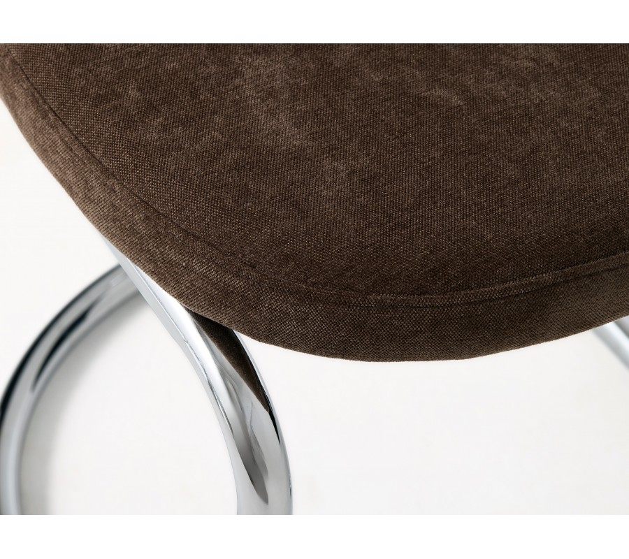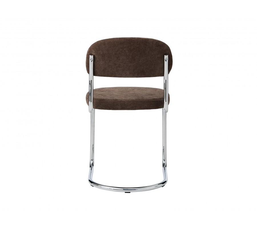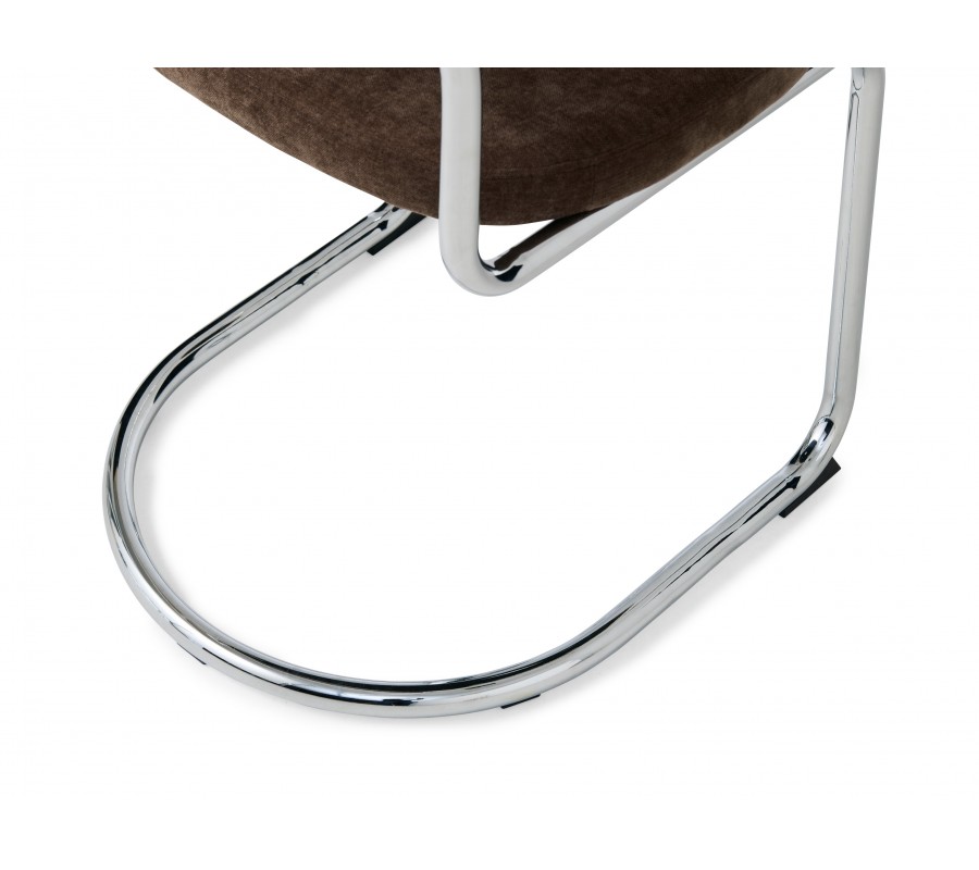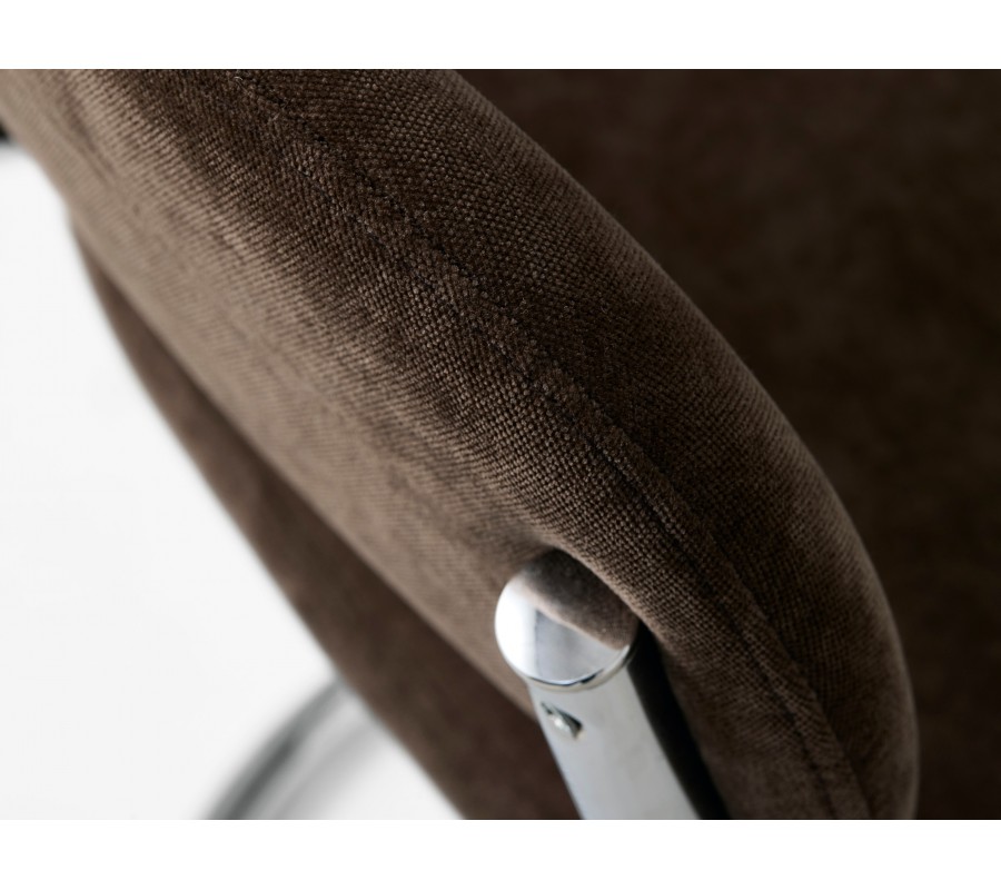 Konštrukcia stoličky je vyrobená z kovu v lesklom chrómovom prevedení. To pôsobí v kombinácii s konzolovým tvarom šarmantným retrofuturistickým dojmom. Poťah je vyrobený z odolného mikrovlákna s na dotyk príjemnou ženilkovou povrchovou úpravou s jemným zamatovým leskom. Bohatá hnedá farba pôsobí teplým dojmom a vytvára estetický kontrast k modernému chrómu.