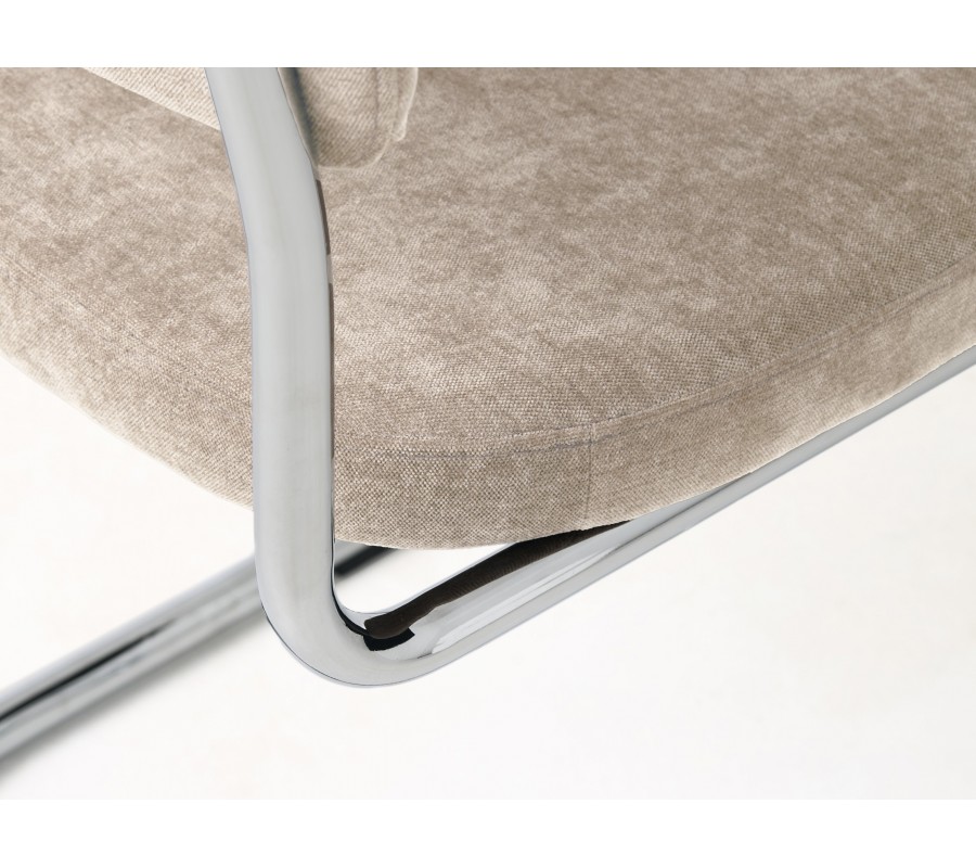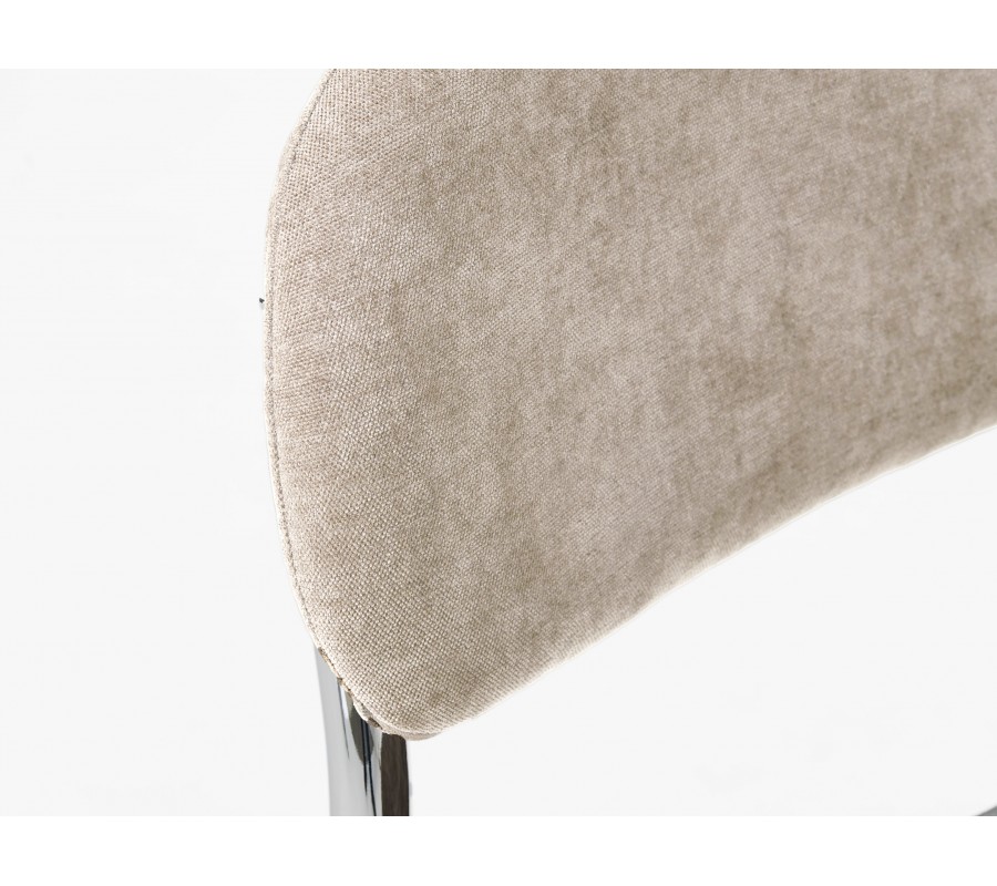 Medzi sedadlom a chrbtovou opierkou vzniká voľný priestor, ktorý ešte zdôrazňuje odľahčený vzhľad stoličky. Vizuálne tieto dve časti prepája ženilkový poťah s jemný zamatovým leskom so svetlom béžovom ľanovom odtieni. Textília je vyrobená z mikrovlákna, ktoré jej zaručuje vysokú odolnosť a zároveň je príjemný na dotyk. Penové čalúnenie zaobľuje tvary a zvyšuje komfort sedenia.