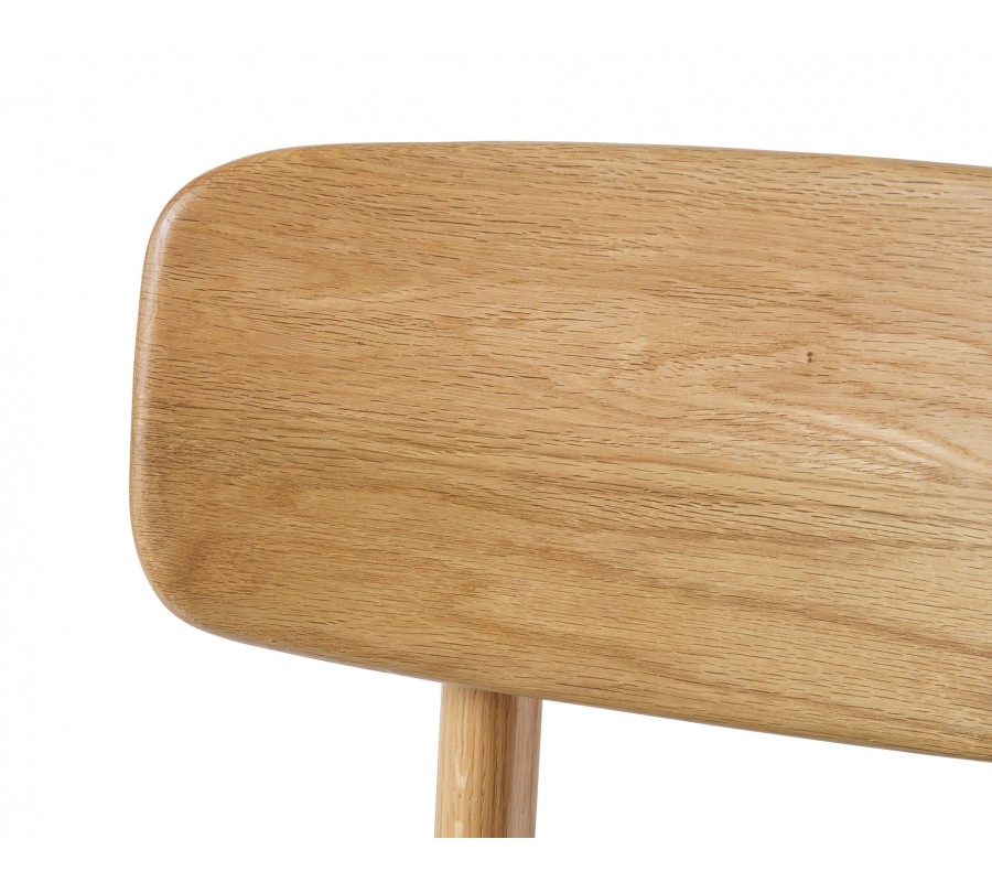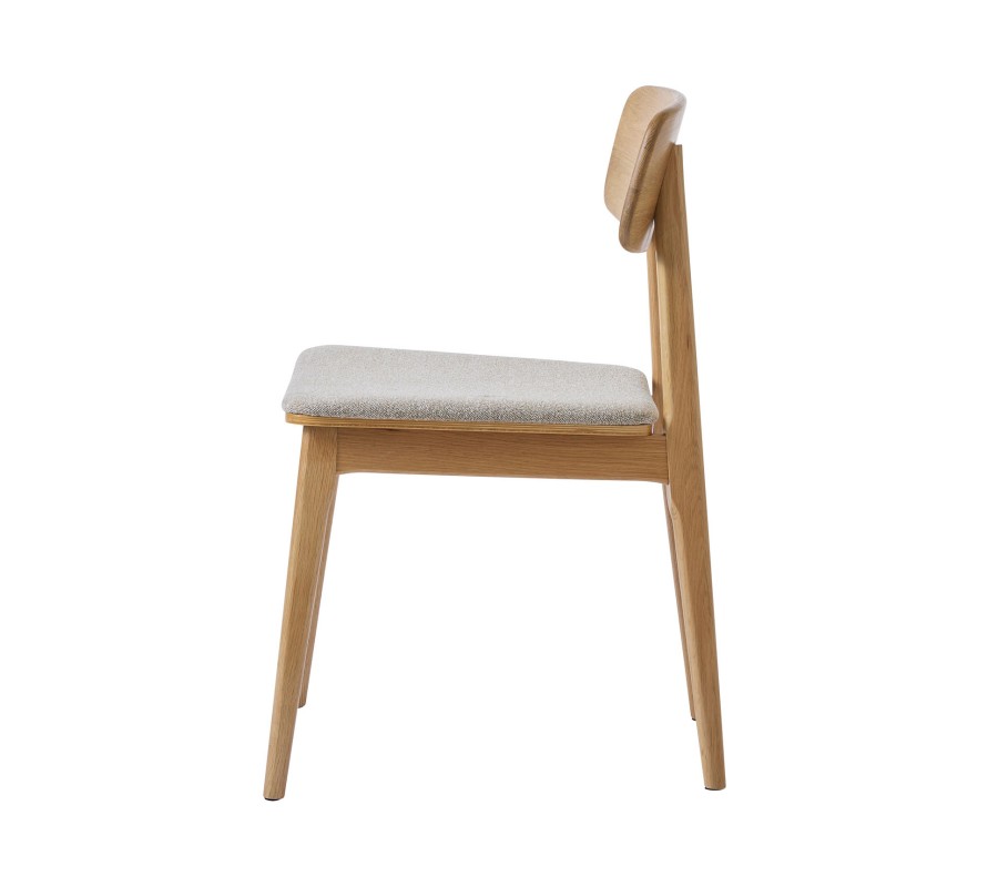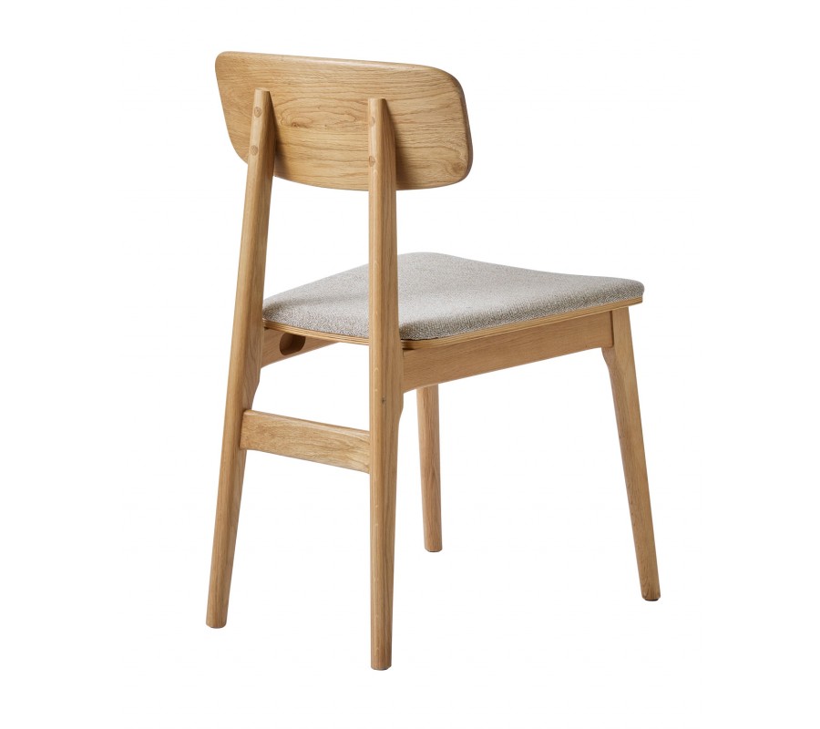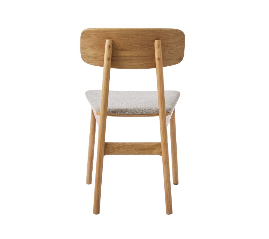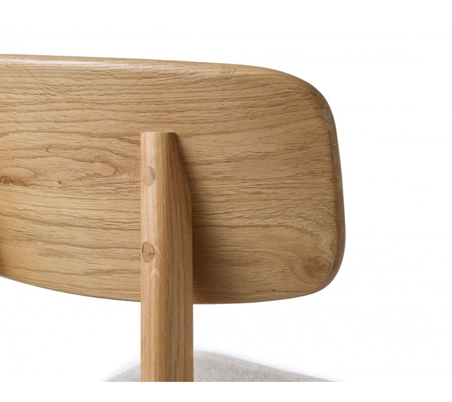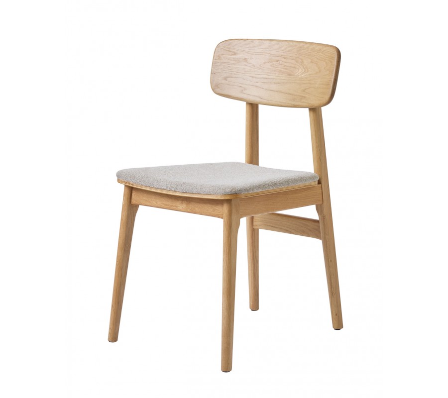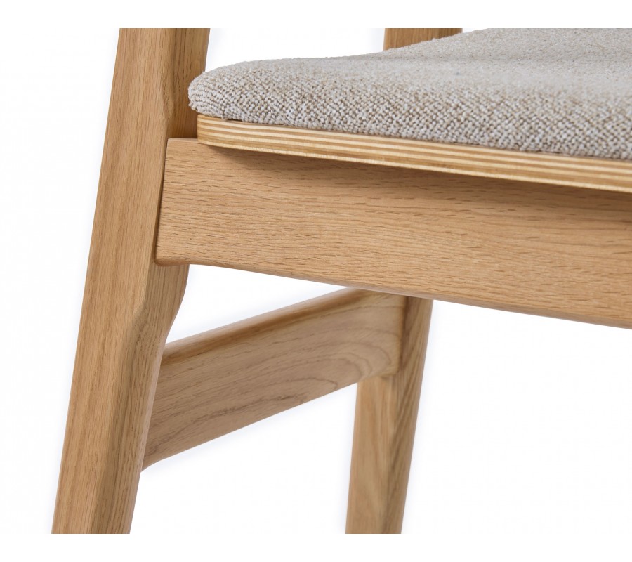 Konštrukcia je vyrobená z dubového dreva v svetlom hnedom odtieni, pričom prirodzená kresba letokruhov zvýrazňuje prírodný charakter materiálu. Sedadlo je čalúnené látkou so slučkovitou štruktúrou, pripomínajúcou jemné buklé. Prevedenie v melírovanej bielo béžovej farbe pôsobí hrejivo. Poťah je príjemný na dotyk a vďaka mikrovláknu aj pevný a odolný.