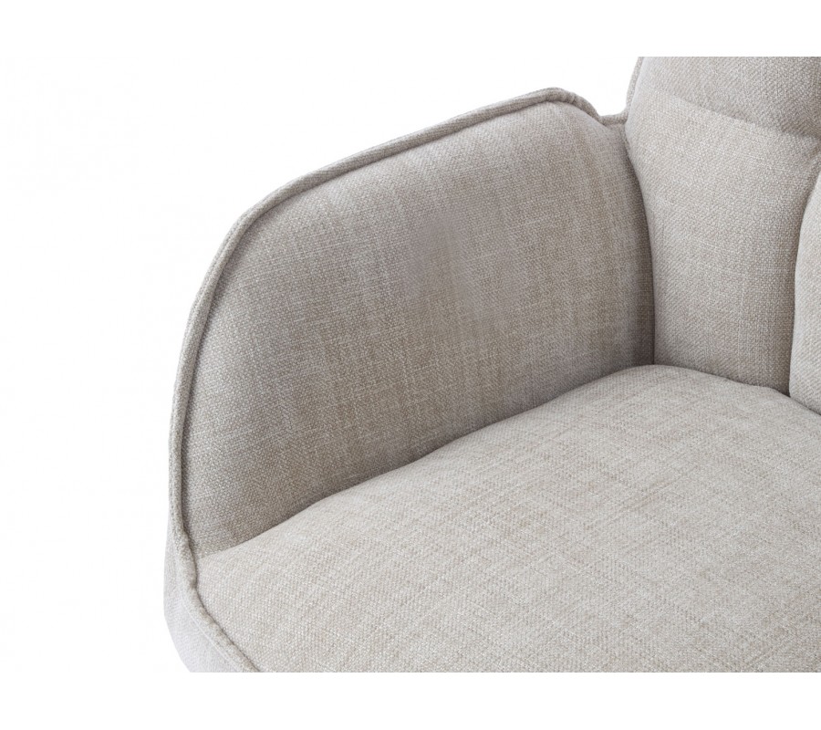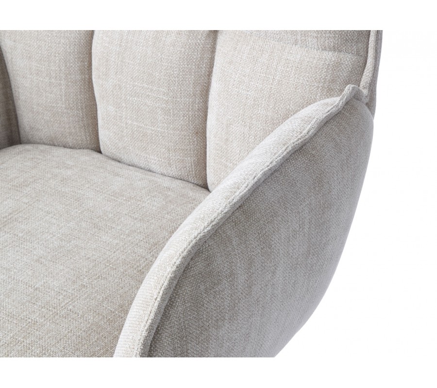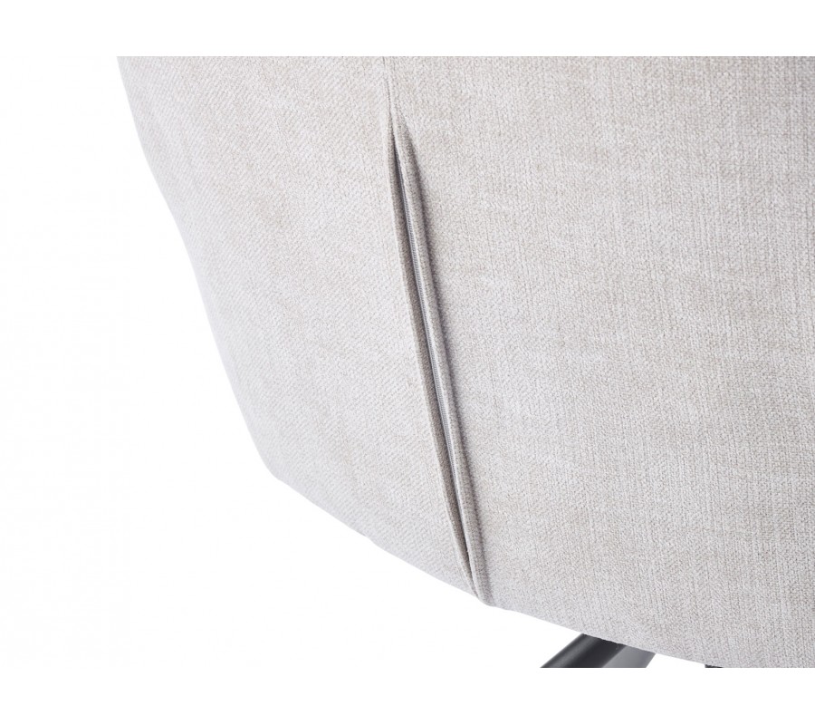 Sedacia časť je bohato čalúnená a potiahnutá látkou so ženilkovou povrchovou úpravou, ktorá je hebká a má decentný zamatový lesk. Svetlá béžová farba v odtieni ľanu pôsobí elegantne a dodáva stoličke škandinávsky výraz. Mikrovlákno zároveň zabezpečuje vysokú odolnosť a dlhú životnosť aj pri každodennom používaní. Dizajn dopĺňa kovová podstava v čiernej farbe, ktorá dodáva celku moderný, mierne industriálny charakter.