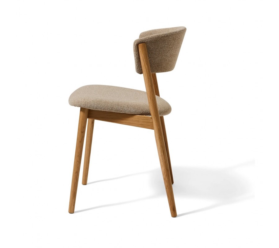 Ergonomicky tvarované sedadlo zabezpečuje pohodlné sedenie aj počas dlhších chvíľ pri stole. Je osadené na obdĺžnikovom ráme, ktorý je spojený s valcovitými nožičkami. Ich zošikmené línie pôsobia dynamicky, zatiaľ čo zúžené zakončenie zvýrazňuje elegantný vzhľad. Zadné nohy plynule prechádzajú nad sedadlo, až k operadlu, ktoré je tvarované do U, aby sa prirodzene prispôsobilo telu. Vrchná hrana opierky má poloblúkovú siluetu.