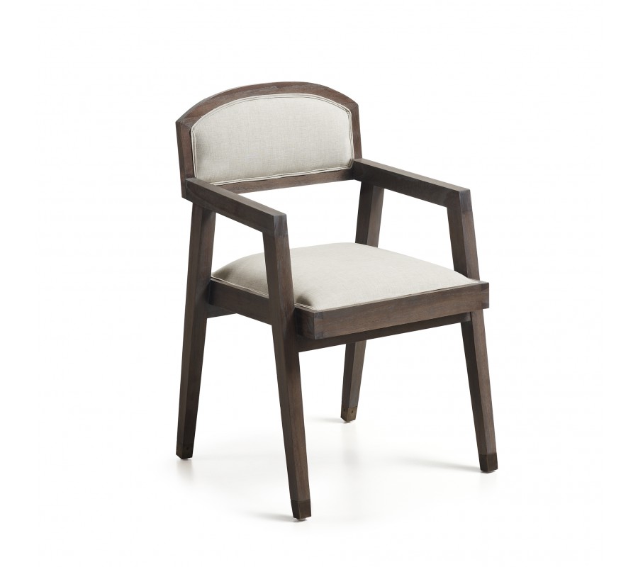 Luxusná štýlová stolička s lakťovými opierkami čalúnená z kolekcie nábytku SPARTAN je vyrobená z masívneho dreva MINDI, hnedo-modro-čierneho výrazu, podobného drevu WENGE. Štýl kolekcie odrzkadluje sedemdesiate roky. Tento nábytok v RETRO štýle dokonale zapadne do vašich domácností ale aj do reštauračných či útulných kaviarenských priestorov.