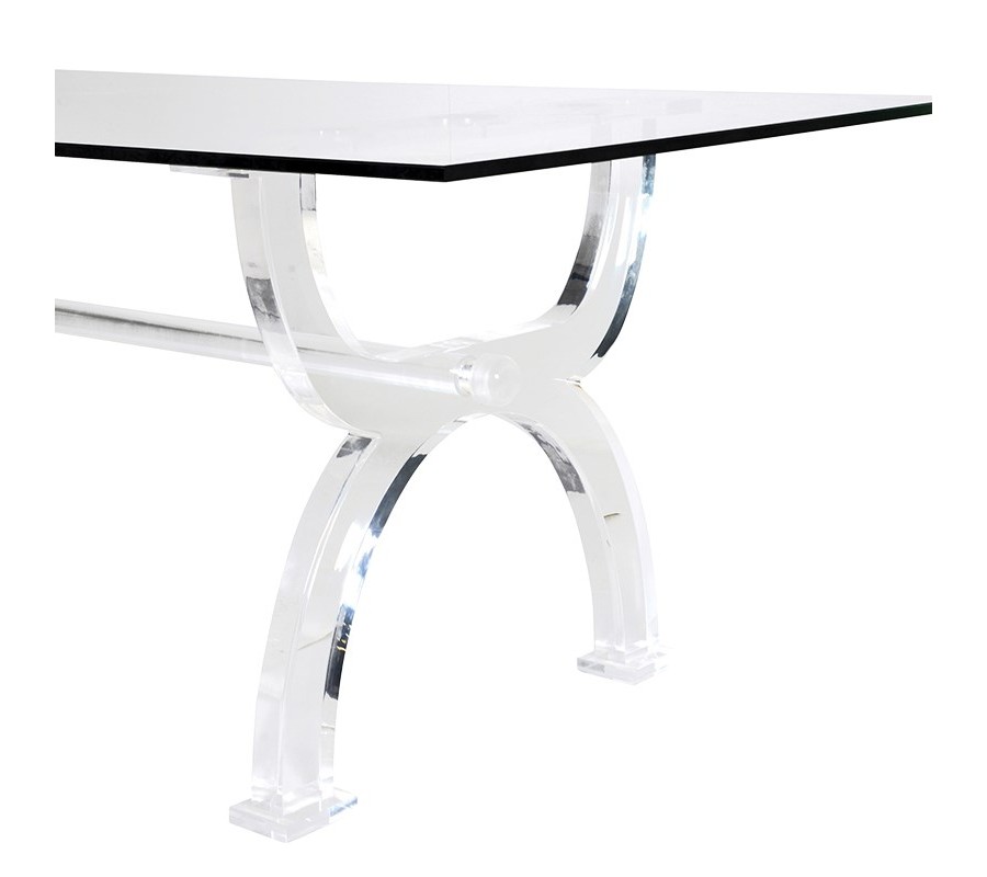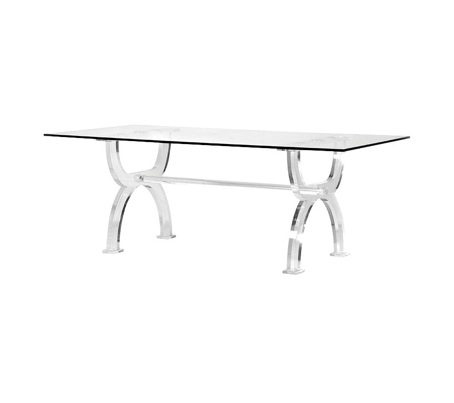 Moderný luxusný konferenčný stolík Eglantine je vytvorený z akrylovej sklenenej konštrukcie. Má zaujímavý tvar rozpolenej kružnice, ktorá vytvára nožičky. Je sklenený a pôsobí vzdušne, opticky zväčšuuje priestor jedálne, dominantným prvkom sú poloblúky po jeho bokoch, typické pre art-deco štýl. Hodí sa aj do miestností s oblúkovytími klembami a doplnili by sme ho stoličkami v kombinácii so sivou a striebornou farbou. Vďaka oblúkom sa hodí do žensky ladených interiérov. Určite treba doplniť štýlovým neutrálnym kobercom, ktorý bude vidno cez stôl aj počas obedovania. Zapadne do moderne, luxusne zariadených interiérov. Celkovým dojmom pôsobí exkluzívne, nadčasovo a rozžiari Váš interiér.