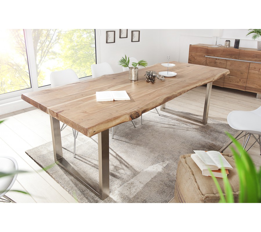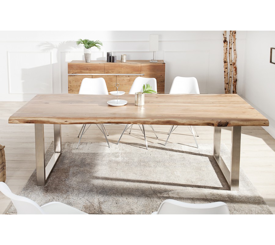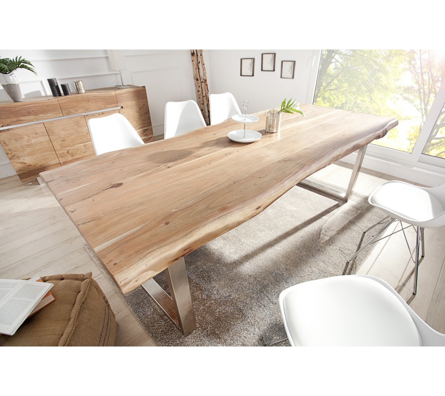 Luxusný moderný jedálenský stôl Mamut 220cm je vyrobený v nepravidelnom tvare pozdĺžnych strán s celkovou veľkosťou: 220cm x 80cm x 100cm (š x v x h), hrúbkou dosky: 60mm, nohy základne: 8cm x 4cm (šxh), farba: prírodná, materiál : masívne drevo akácie, lakované, základňa - nerezový oceľový rám. Vďaka ručnému spracovaniu sa od seba môžu jednotlivé kusy mierne líšiť.