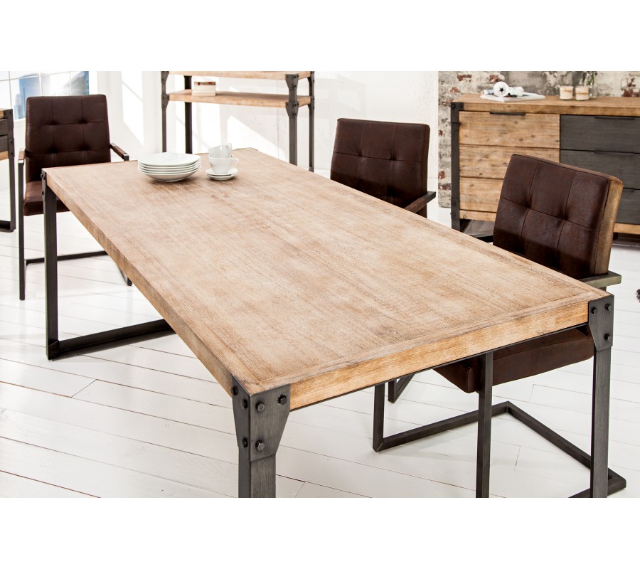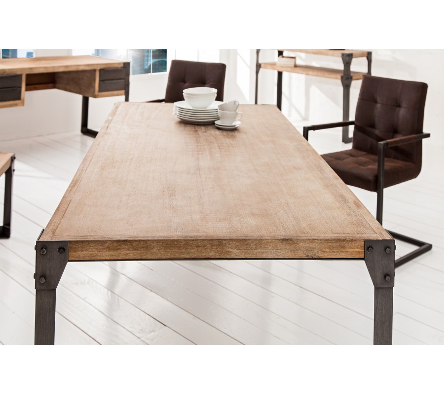 Štýlový jedálenský stôl z kolekcie industriálneho nábytku Factory je typickým predstaviteľom industriálneho štýlu. Jeho jedinečnosť môžeme uvidieť na kombinácii masívneho dreva s kovom. Elegantný jedálenský stôl je ideálnou voľbou predovšetkým do industriálne zariadených domácností a loftov.