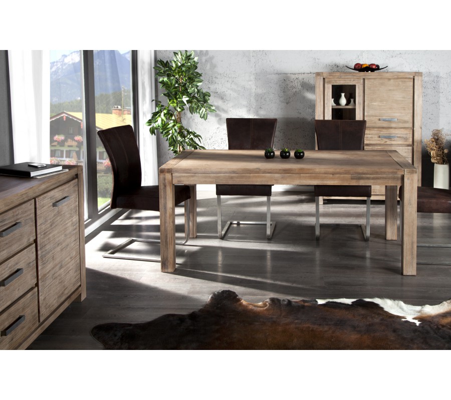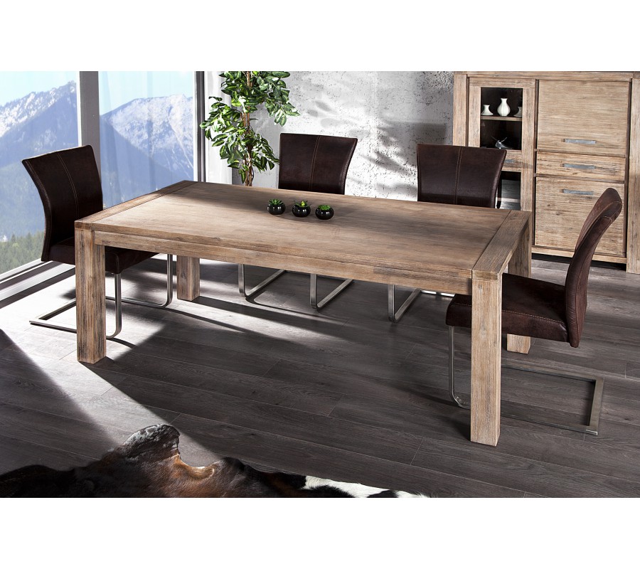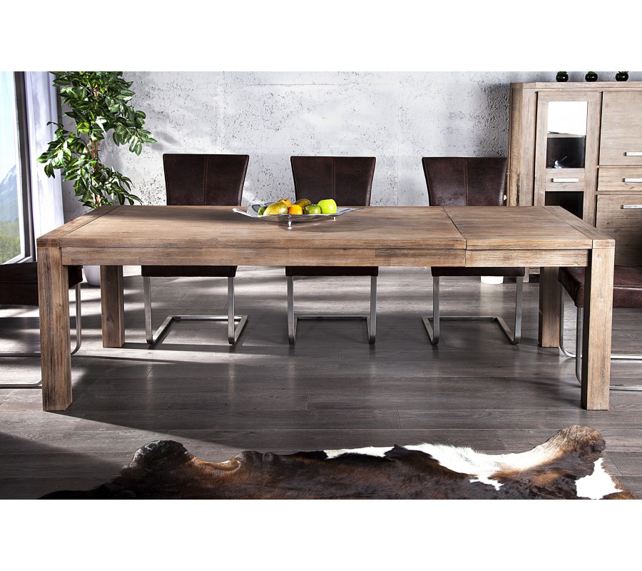 Dizajnový jedálenský stôl Montreal rozkladací 180-230cm pôsobí masívnym a zároveň elegantným dojmom, doplneným o zaujímavý farebný nádych. Farba: prírodný vápenné, materiál: masívne drevo akácie, vápenný. Vďaka originálnemu spracovaním dreva je každý kus nábytku jedinečný.