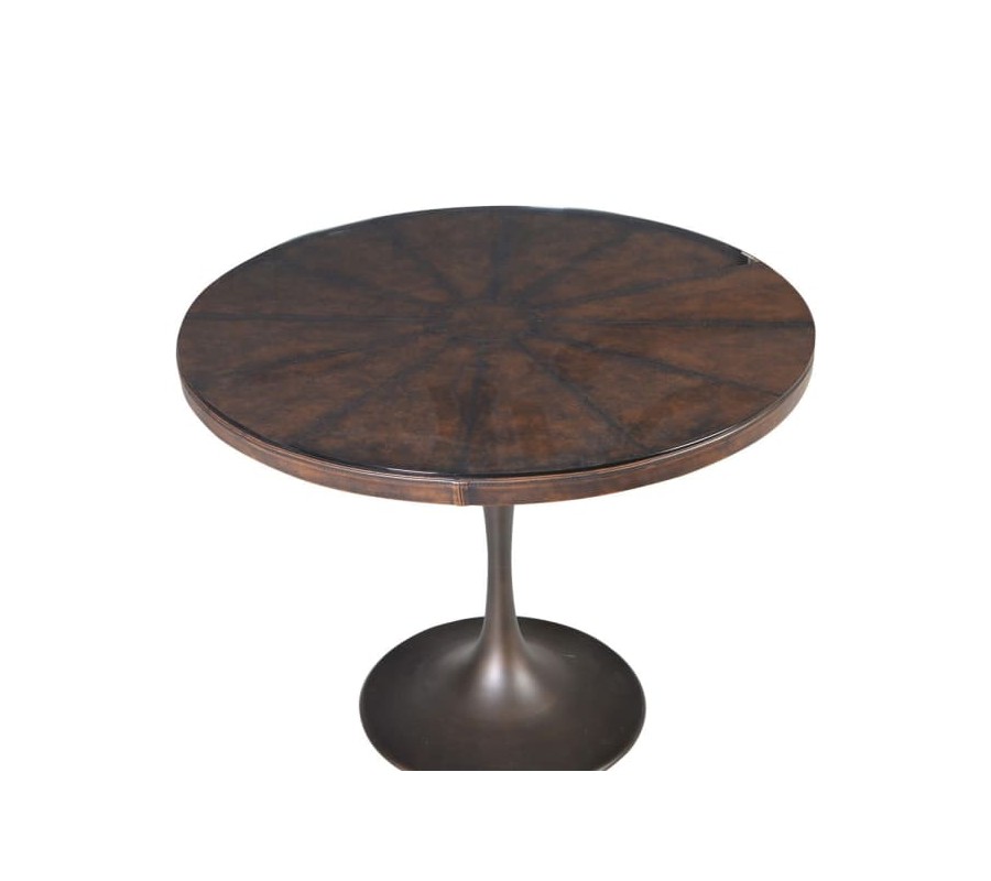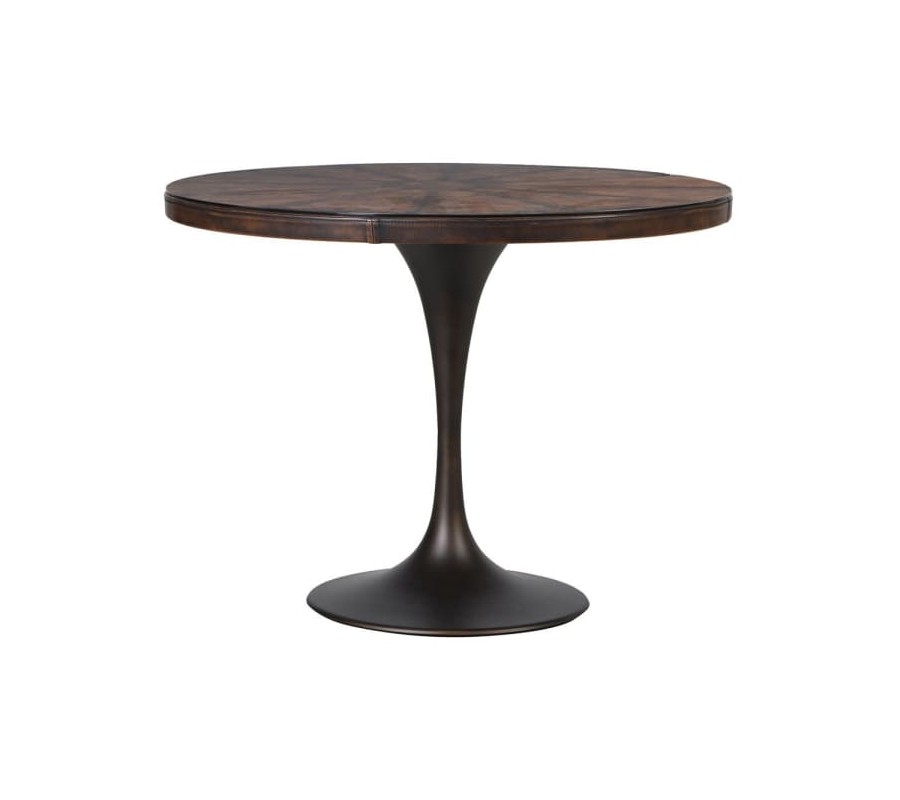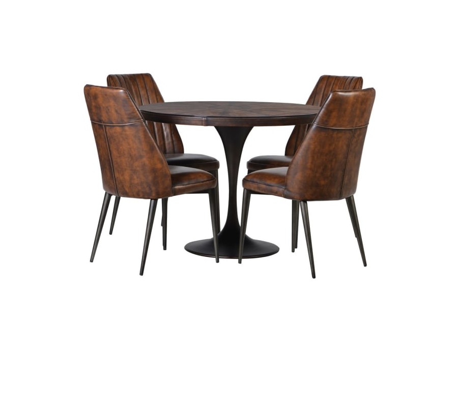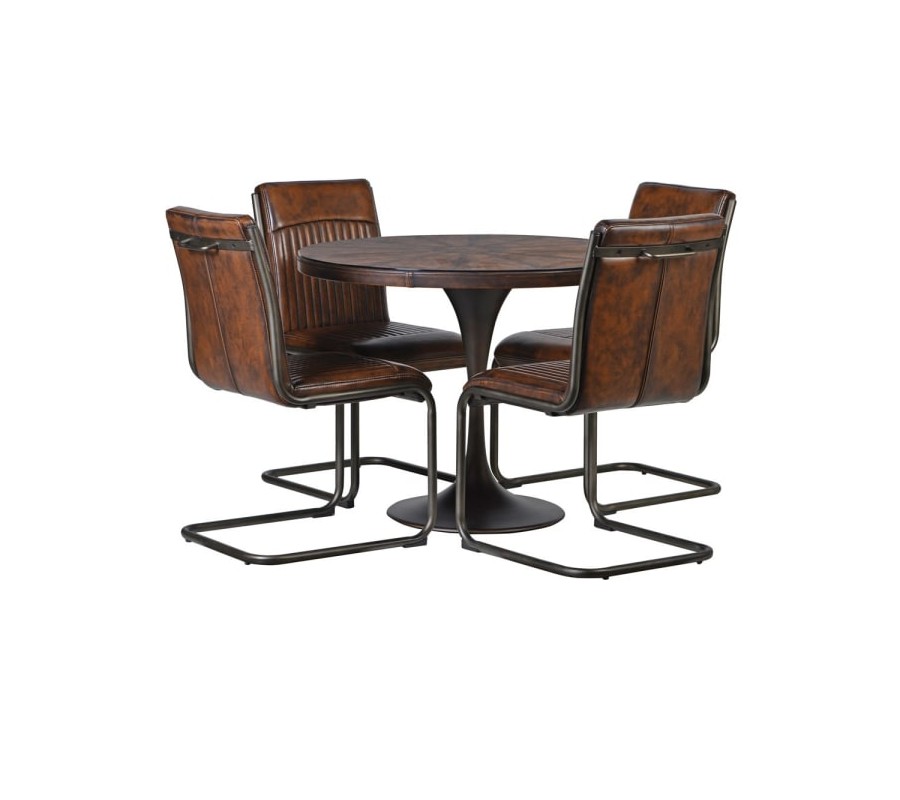 Okrúhly kožený jedálenský stôl má hornú dosku potiahnutú kvalitnou ekokožou. Na vrchnej doske je temperované sklo, ktoré dotvára eleganciu tohto industriálneho kúska. Stolík stojí na pevnej kovovej konštrukcii tmavohnedej farby, ktorá vyzerá ako stopka vínového pohára. Stôl pohodlne obsadí štyri osoby. Stolík sa hodí do každej modernej jedálne, štýlovo vynikne v kombinácií so stoličkami rovnakého industriálneho štýlu či metalovými a lesklými prvkami.