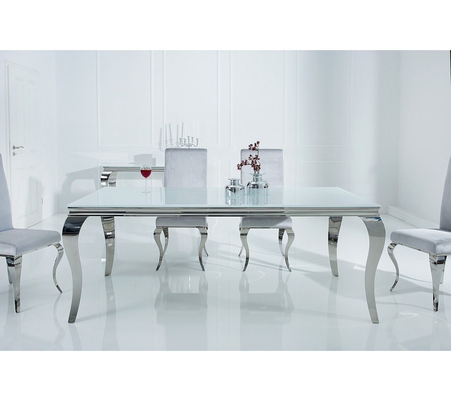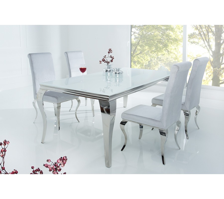 Luxusný jedálenský stôl z kolekcie Modern Barock v bielom prevedení sa skvele hodí do moderne zariadených jedální. Ideálnym doplnkom k nemu sú luxusné jedálenské stoličky so zamatovým povrchom z rovnakej kolekcie. Materiál: leštená nerezová oceľ, opálové tvrdené sklo.