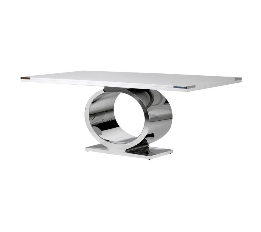 Jedálenský stôl Wielton Blanc je zaujímavým prepojením luxusného prevedenia a čistých geometrických línií. Doska klasického obdĺžnikového tvaru sa nesie v bielej farbe s kovovými aplikáciami na rokoch, ktoré zasa ladia s chrómovou kovovou konštrukciou v tvare kruhu. Stôl pôsobí skutočne originálne a vo vašej jedálni môže byť dominantným kúskom, ktorý upúta už na prvý pohľad. Hodí sa najmä do svetlejších a moderne zariadených jedální či do luxusných konferenčných miestností, prípadne v kombinácii s výraznými farbami ako červená či zelená. Je ideálny prepohodlné usadenie štyroch až šiestich osôb.