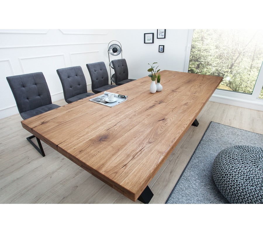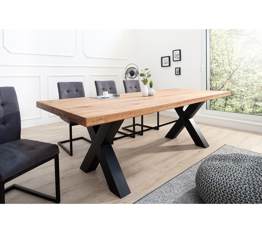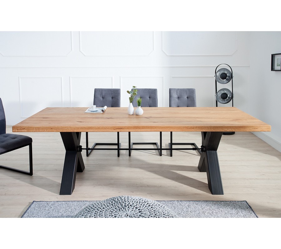 Luxusný industriálne ladený jedálenský stôl Thor môže byť dominantou aj Vašej jedálne! Šírka 240cm zaručuje pohodlné sedenie pre veľký rodinný a priateľský kruh. Masívna vrchná doska je hrubá 60mm, vďaka čomu budí naozaj solídny dojem. Váha stola je približne 150kg. Štýlová podstava do X robí zo stola jedinečný kúsok nábytku.