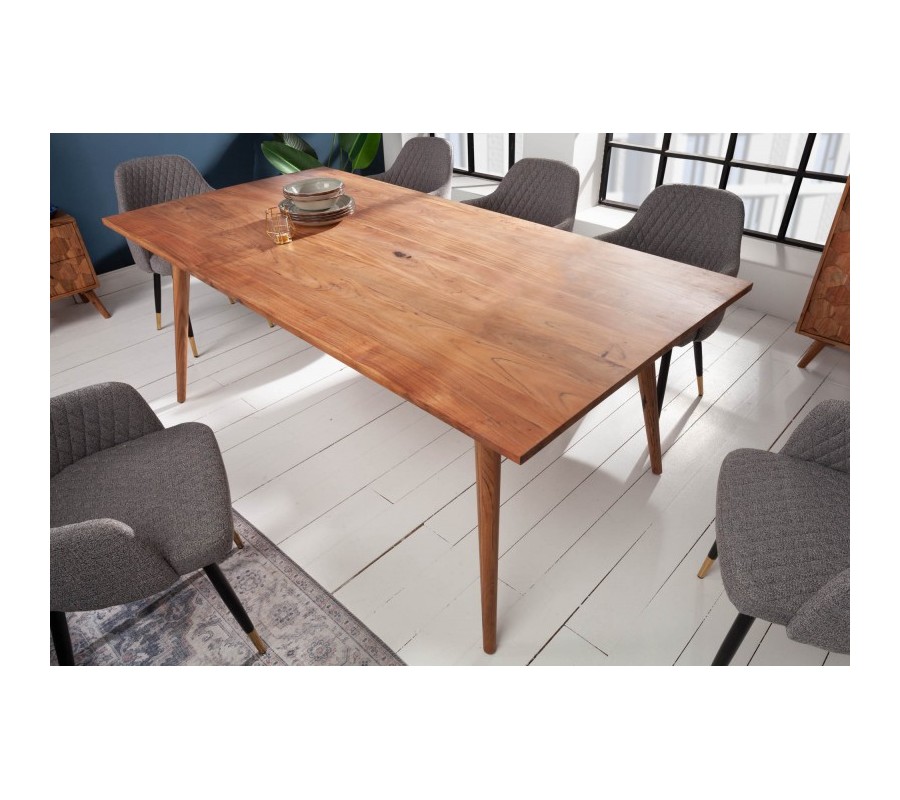 Štýlový jedálenský stôl o šírke 200cm z kolekcie masívneho nábytku Mozaika je jasnou voľbou do dizajnových jedální. Lakovaná doska z masívu o hrúbke 20mm sa vyznačuje typickou kresbou svetlého akáciového dreva. Stôl je vhodné kombinovať s čalúnenými stoličkami.