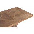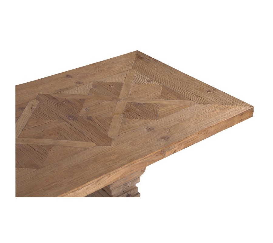 Luxusný vintage obdĺžnikový jedálenský stôl Carence v naturálnej hnedej farbe s parketovým dizajnom a vyrezávanými nohami 220 cm