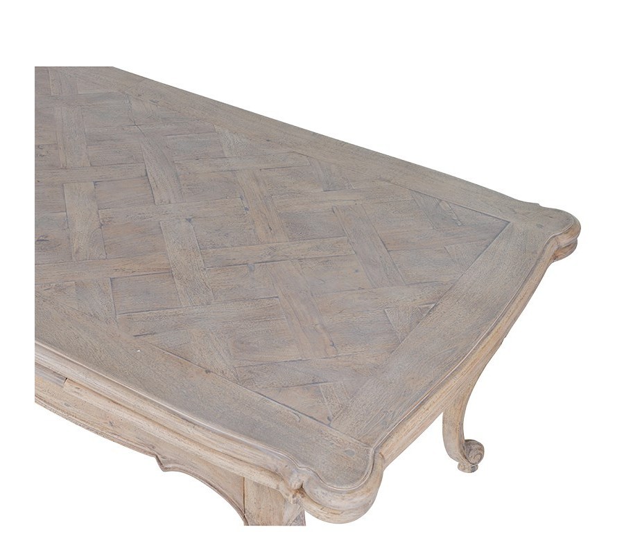 Vrchná doska má obdĺžnikový tvar a vďaka rozkladaciemu mechanizmu je možné stôl zväčšiť podľa potreby, po jednoduchom rozložení ukrytých spodných dosiek má stôl dĺžku 390 cm, čím zabezpečuje miesto až pre 18 osôb. Povrch dosky zdobí geometrický vzor vytvorený, z drevených lamiel ukladaných do krížených obdĺžnikov, čím vzniká sofistikovaná mozaika evokujúca tradičné parketové vzory. Tento detail dodáva stolu charakter a vnáša do priestoru remeselný nádych.
