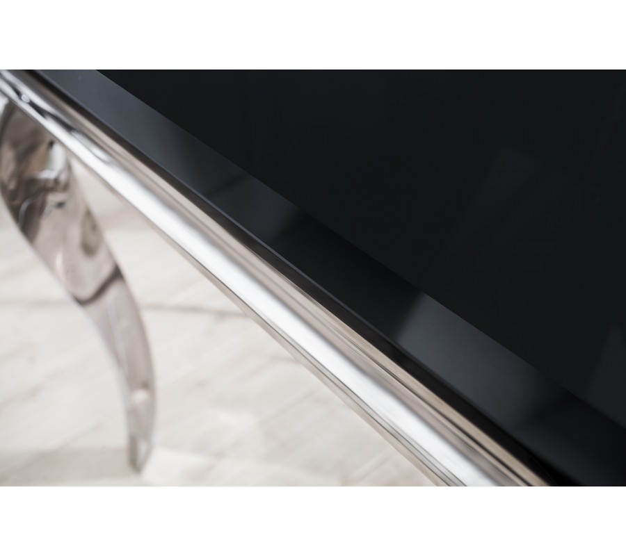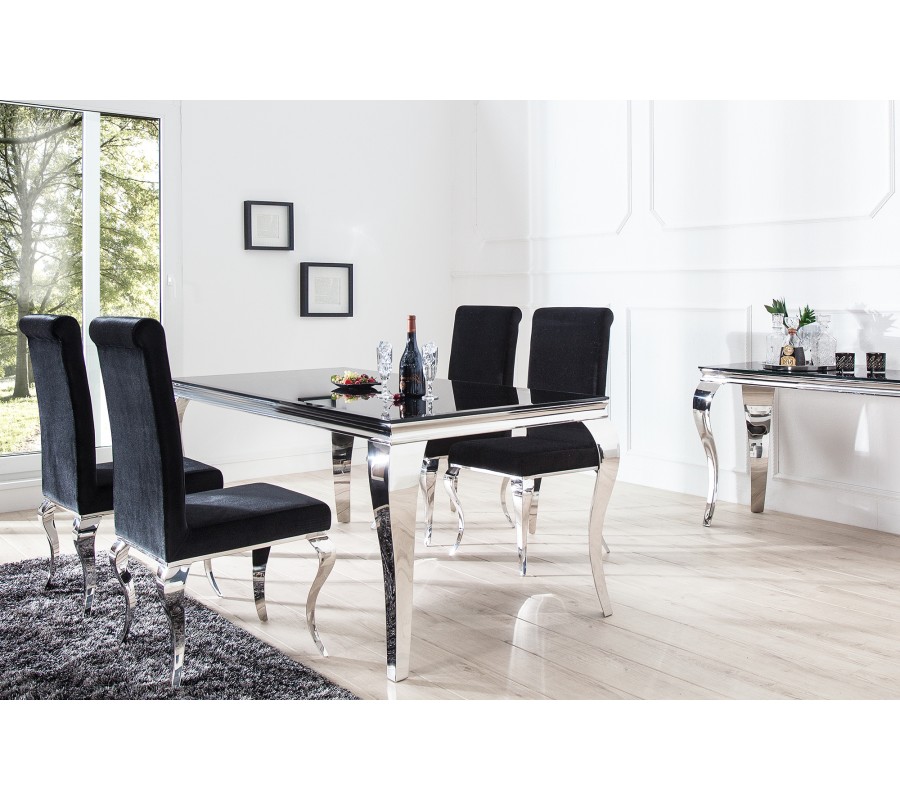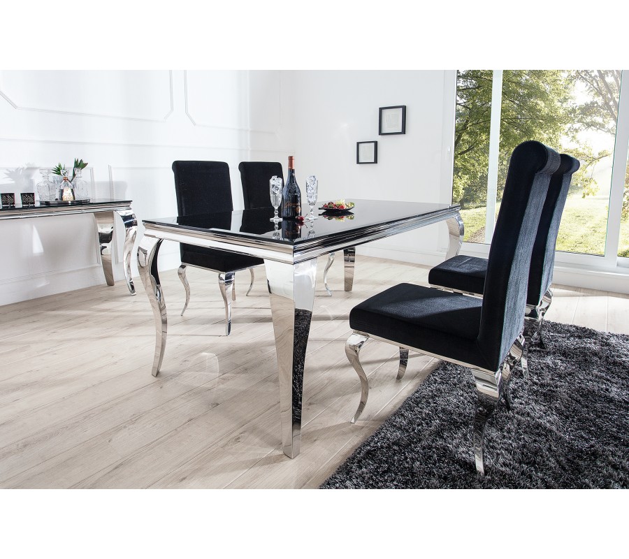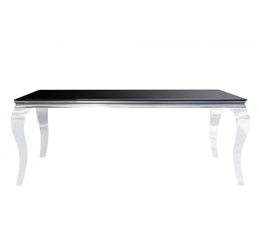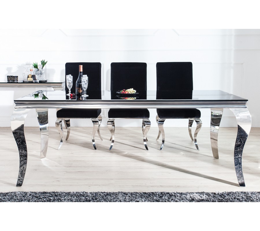 Luxusný jedálenský stôl Modern Barock dlhý 200cm v sebe unikátne spája moderné a barokové prvky. Je vhodnou voľbou najmä do moderne zariadených jedální a kuchýň, ktorým dodá nádych elegancie a luxusu. Elegantné zahnuté nohy s barokovým nádychom vytvárajú spolu s čiernou, sklenenou povrchovou doskou unikátny a neprehliadnuteľný celok. Luxusné čierne stoličky z rovnakej kolekcie budú k nemu ideálnou voľbou. Materiál: opálové sklo, tvrdené sklo, leštená nehrdzavejúca oceľ
