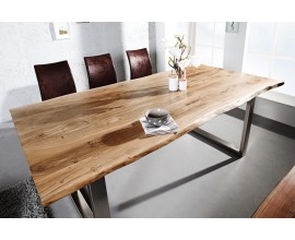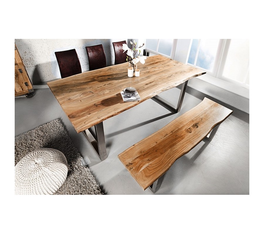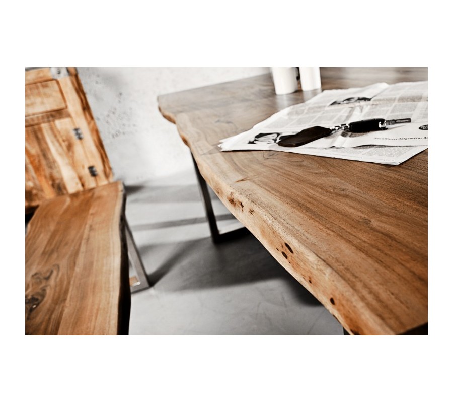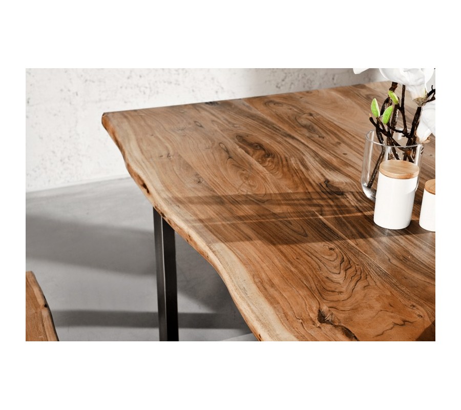 Dizajnový jedálenský stôl Mammut vás zaujme najmä svojím elegantným a dizajnovým prevedením. Je vyrobený z masívneho akáciového dreva, ktoré vytvára nádherný prírodný dojem. Prírodný materiál je doplnený o kovové nohy, ktoré spolu vytvoria zaujímavý industriálny vzhľad. Skvelo vynikne v svetlých priestoroch a industriálne či alternatívne ladených jedálňach. Odporúčame taktiež kombináciu s masívnym nábytkom a doplnkami v naturálnom kolorite.