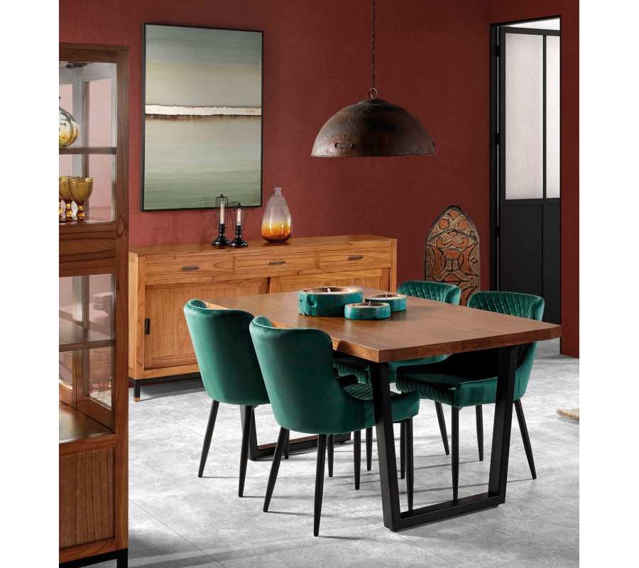 Luxusný jedálenský stôl Madhu je štýlovým kúskom, ktorý skvelo zapadne do industriálne, ale aj koloniálne ladených jedální. Povrchová doska je vyrobená z masívneho dreva mindi, ktoré do miestnosti vnesie príjemný naturálny nádych a taktiež vám zaručí skvelú kvalitu a dlhú životnosť. Prírodný materiál je doplnený čiernou železnou konštrukciou. Vzniká tak skutočne dizajnový kontrast, ktorý bude vo vašom interiéri pôsobiť dominante, no zároveň vďaka univerzálnej farebnosti nebudete mať problém s jeho doladením a hodí sa takmer kamkoľvek. Jedálenský stôl Madhu skvelo vynikne v kombinácii s nábytkom z masívu či s výraznými kovovými doplnkami.